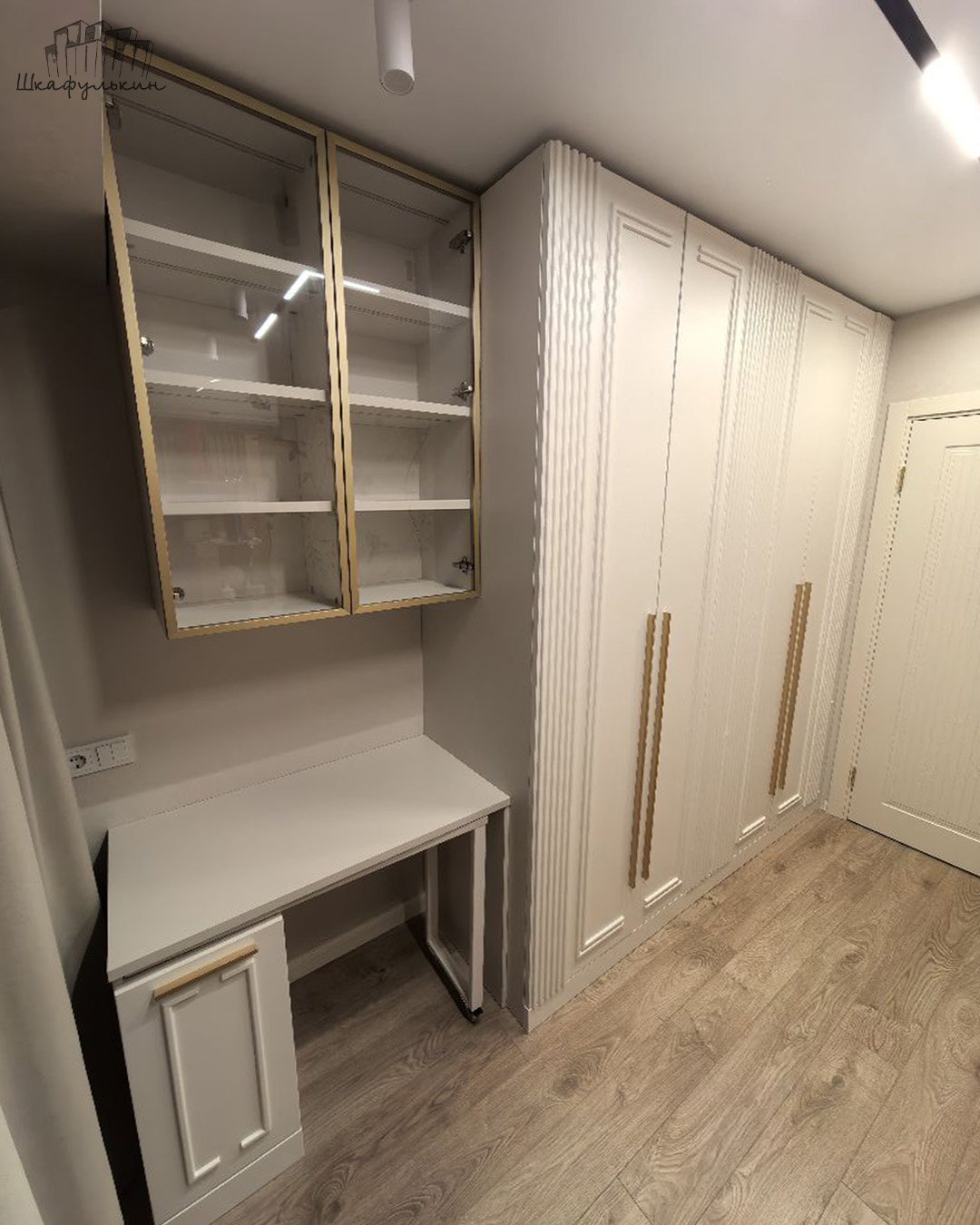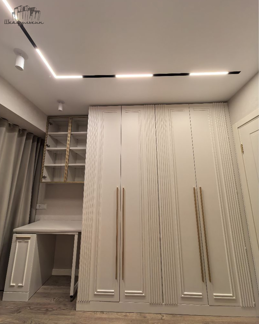 Шкаф "Галлардо" с фрезеровкой в виде симметричных молдингов визуально увеличивает высоту потолка, создавая главный акцент на деталях интерьера и хорошо дополняет стены с декоративными элементами.