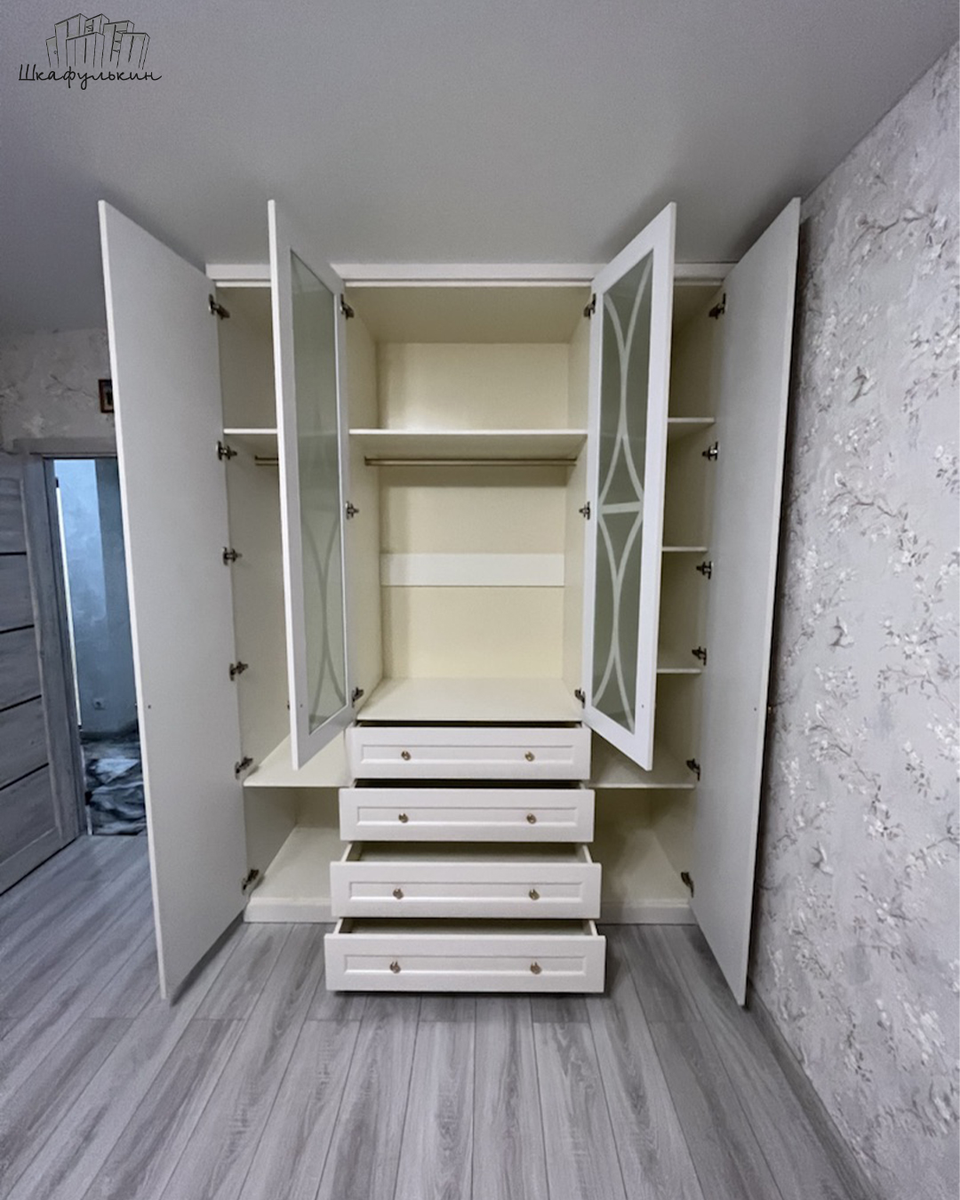 Шкаф состоит из двух массивных фасадов и двойных створок от платяного отсека. Выдвижные ящики располагаются согласно компоновке внешнего вида шкафа, по желанию могут оснащаться доводчиками.