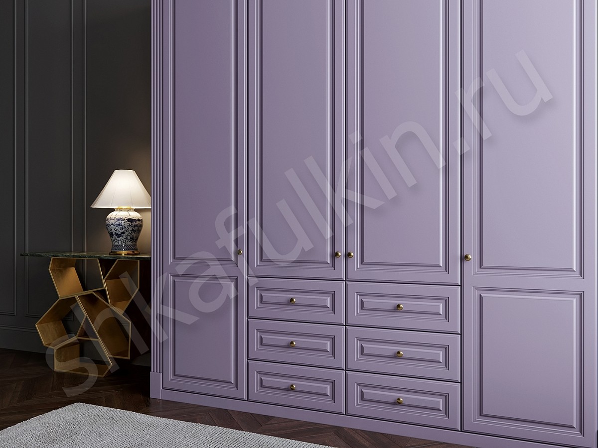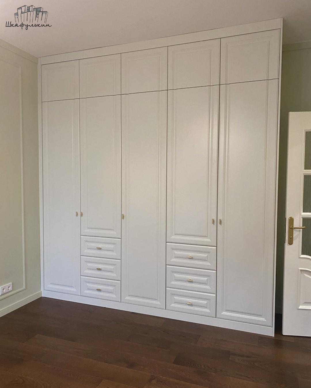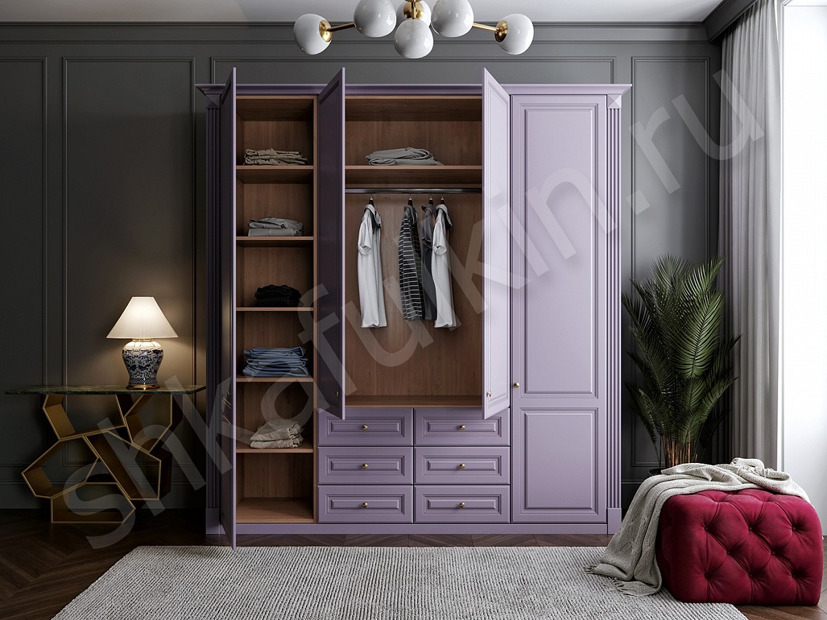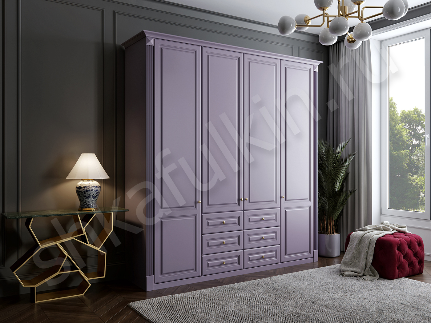 Шкаф состоит из двух массивных фасадов и двойных створок от платяного отсека. Выдвижные ящики располагаются согласно компоновке внешнего вида шкафа, по желанию могут оснащаться доводчиками.