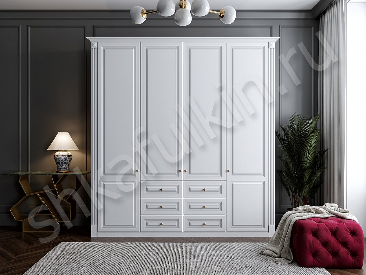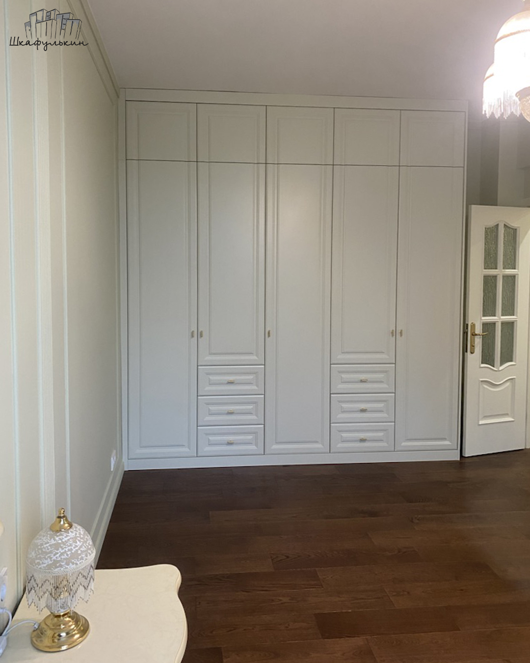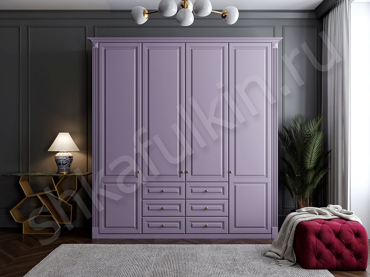 Шкаф состоит из двух массивных фасадов и двойных створок от платяного отсека. Выдвижные ящики располагаются согласно компоновке внешнего вида шкафа, по желанию могут оснащаться доводчиками.