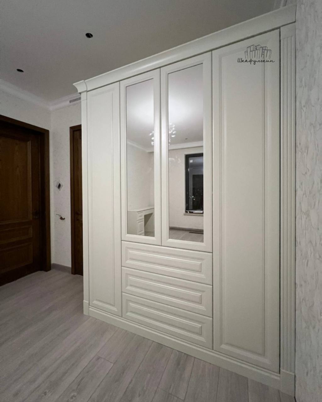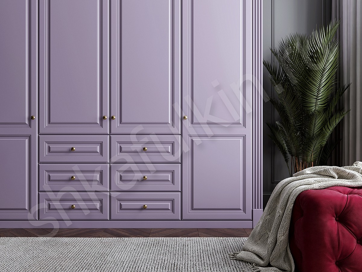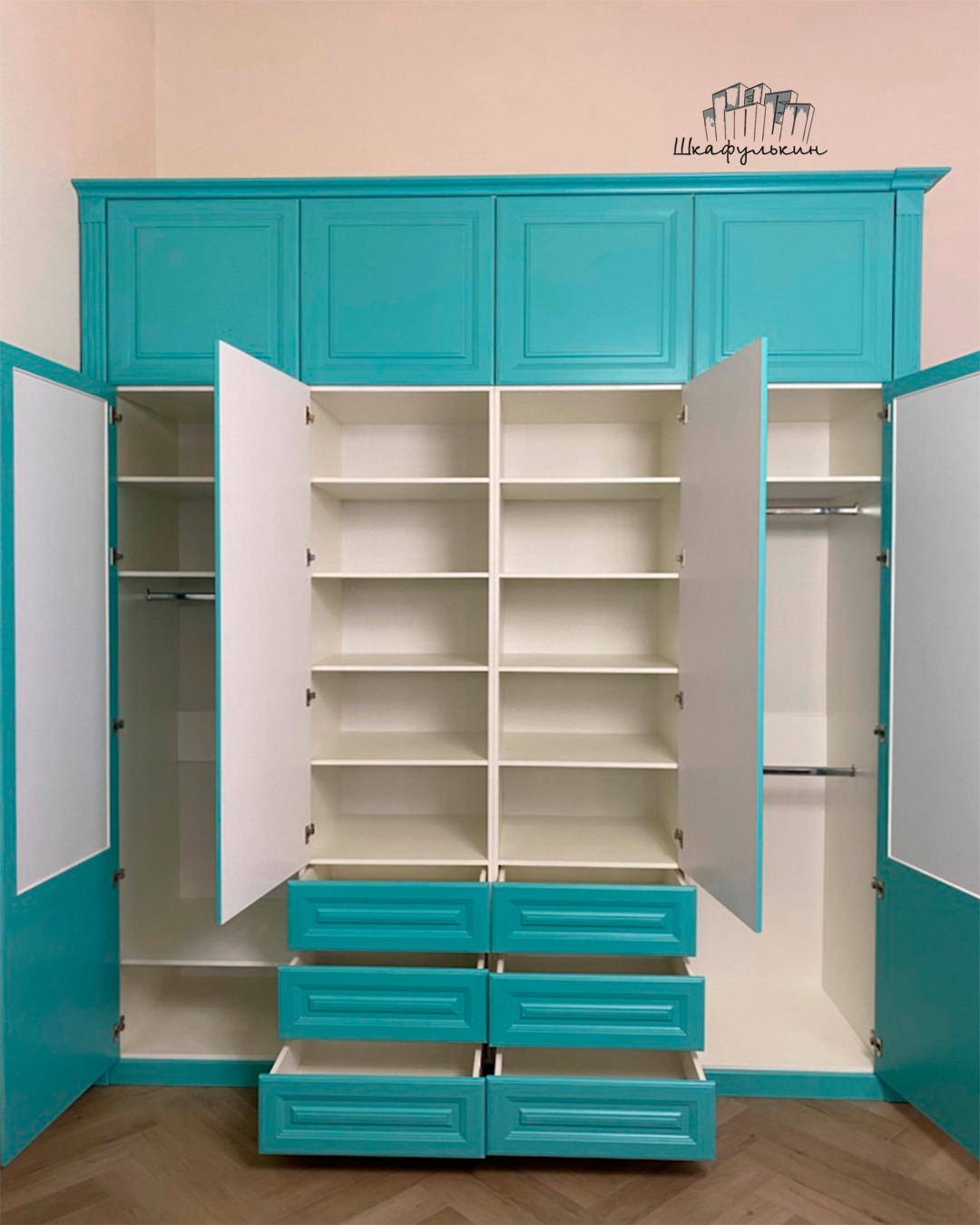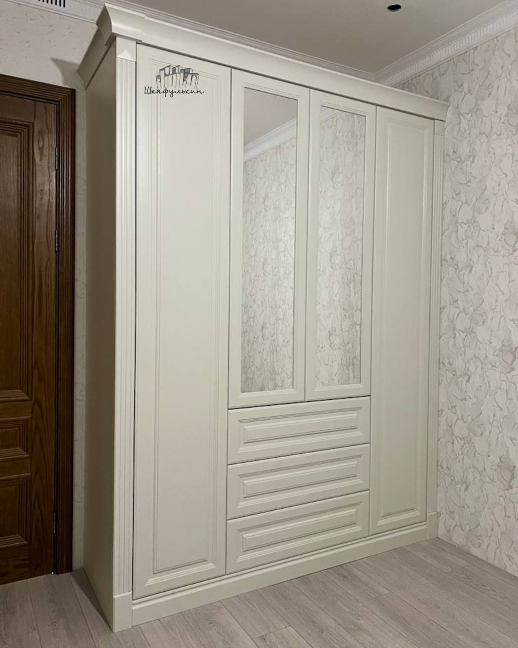 Шкаф состоит из двух массивных фасадов и двойных створок от платяного отсека. Выдвижные ящики располагаются согласно компоновке внешнего вида шкафа, по желанию могут оснащаться доводчиками.