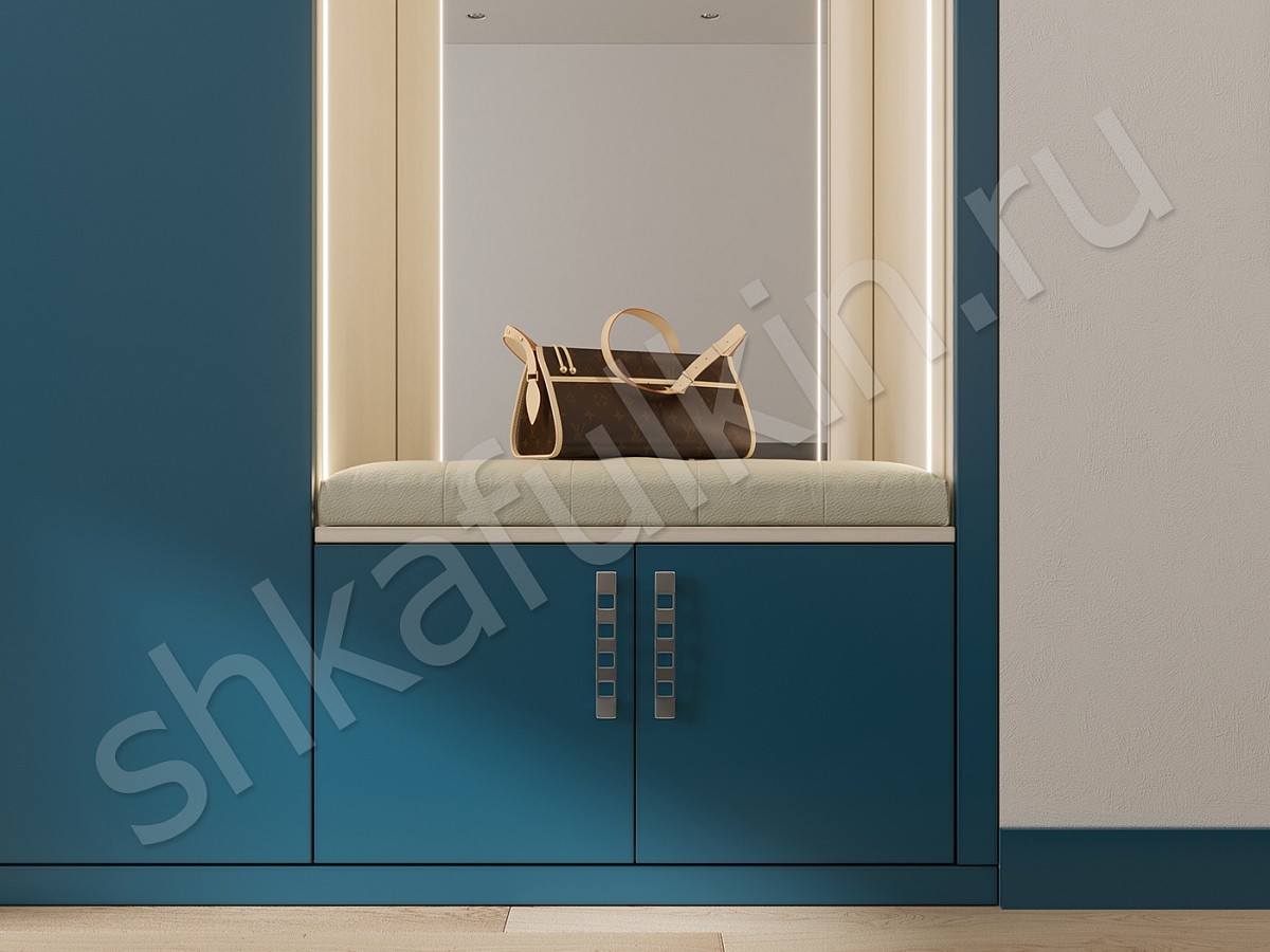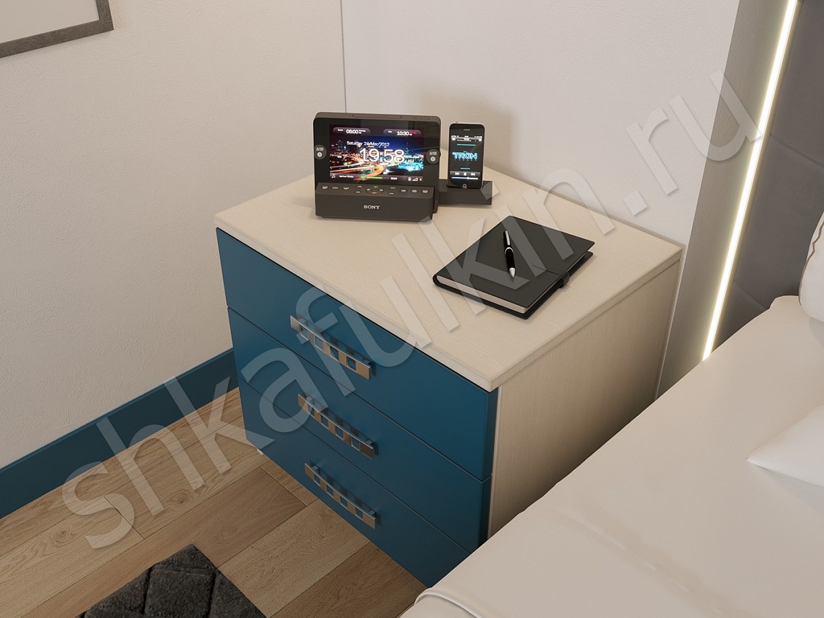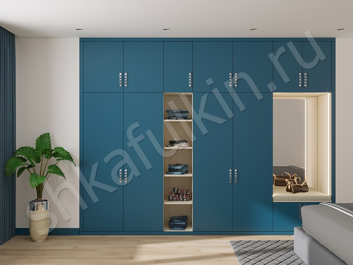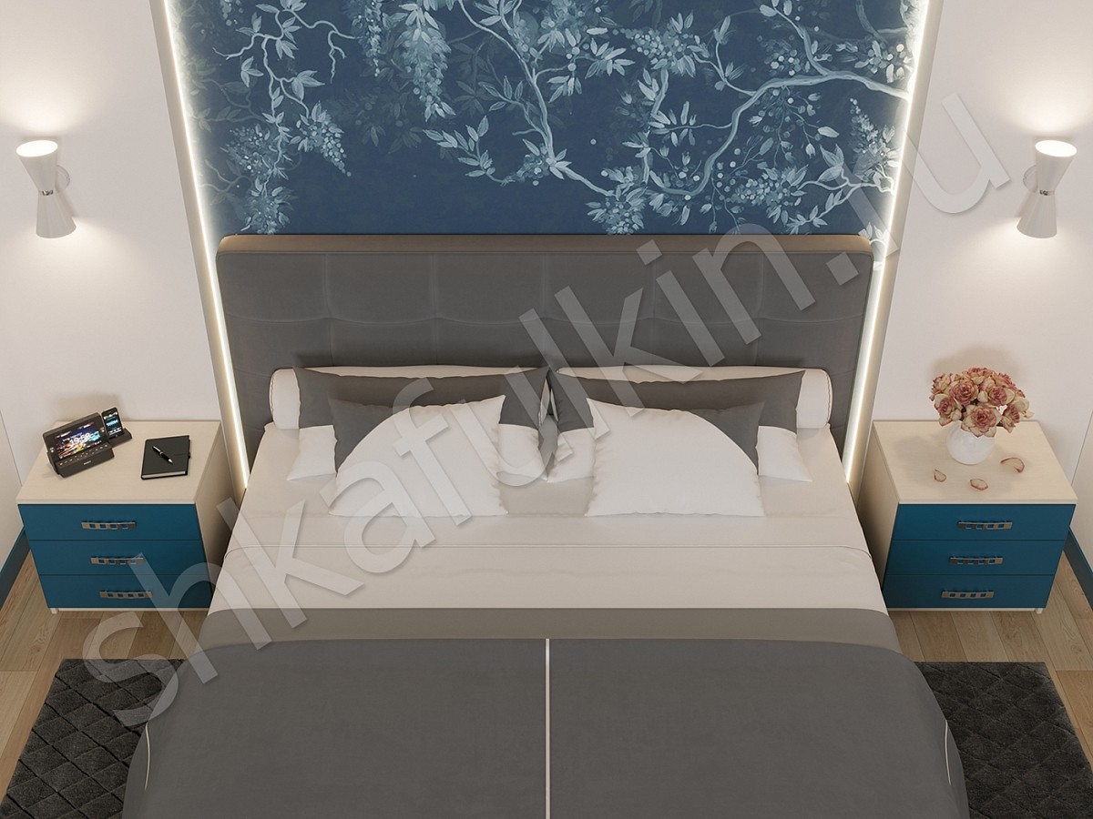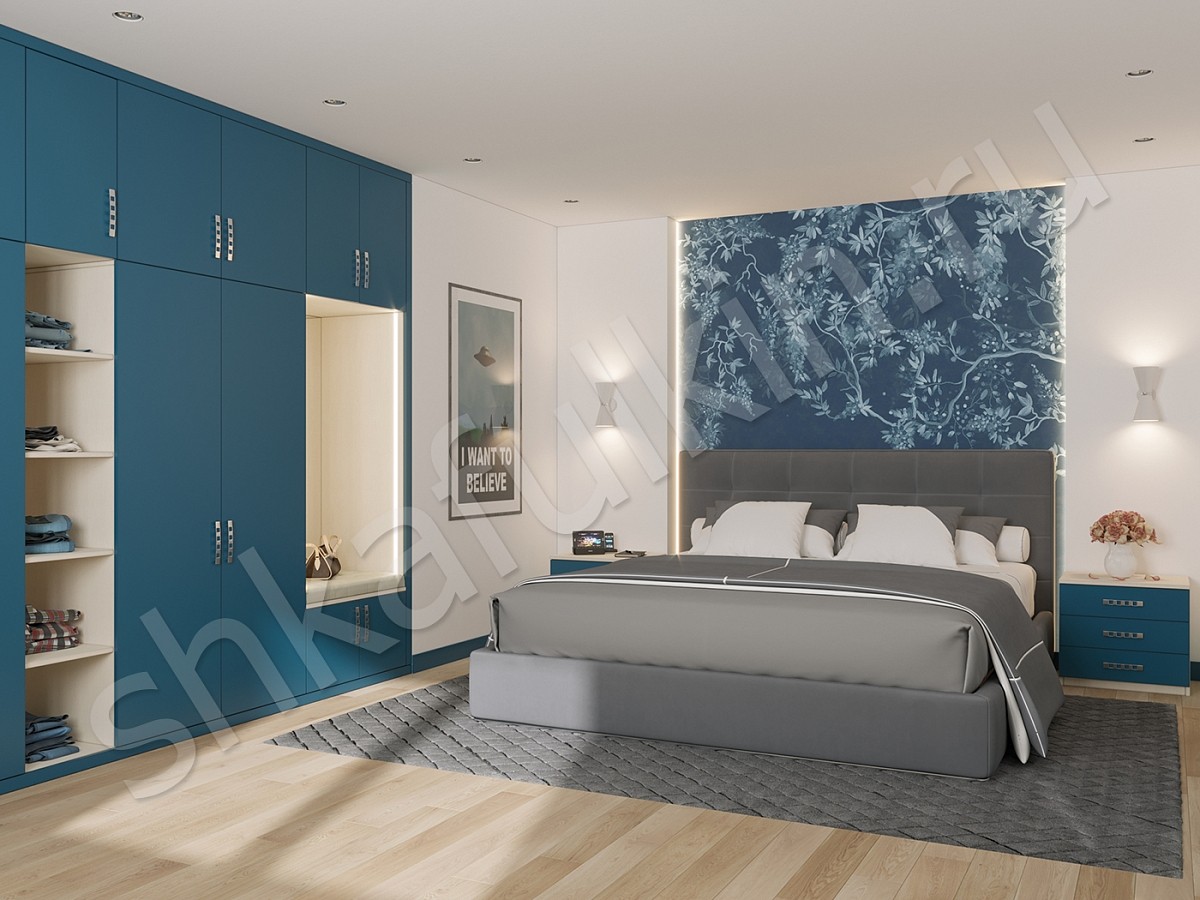 Главное предназначение спальни — это обеспечение комфортного и полноценного отдыха. Дизайн спальни в доме для достижения этих целей играет немаловажную роль, а выбор основного цвета должен создавать своеобразное настроение. Для хорошего, приятного и спокойного сна можно выбрать спальню светлых оттенков с мебелью синего цвета. Именно синий помогает расслабиться после тяжелого дня и отстраниться от всего. В шкафу Понтиак предусмотрена подсветка в алюминиевом корпусе со светодиодной лентой и рассеивателем.