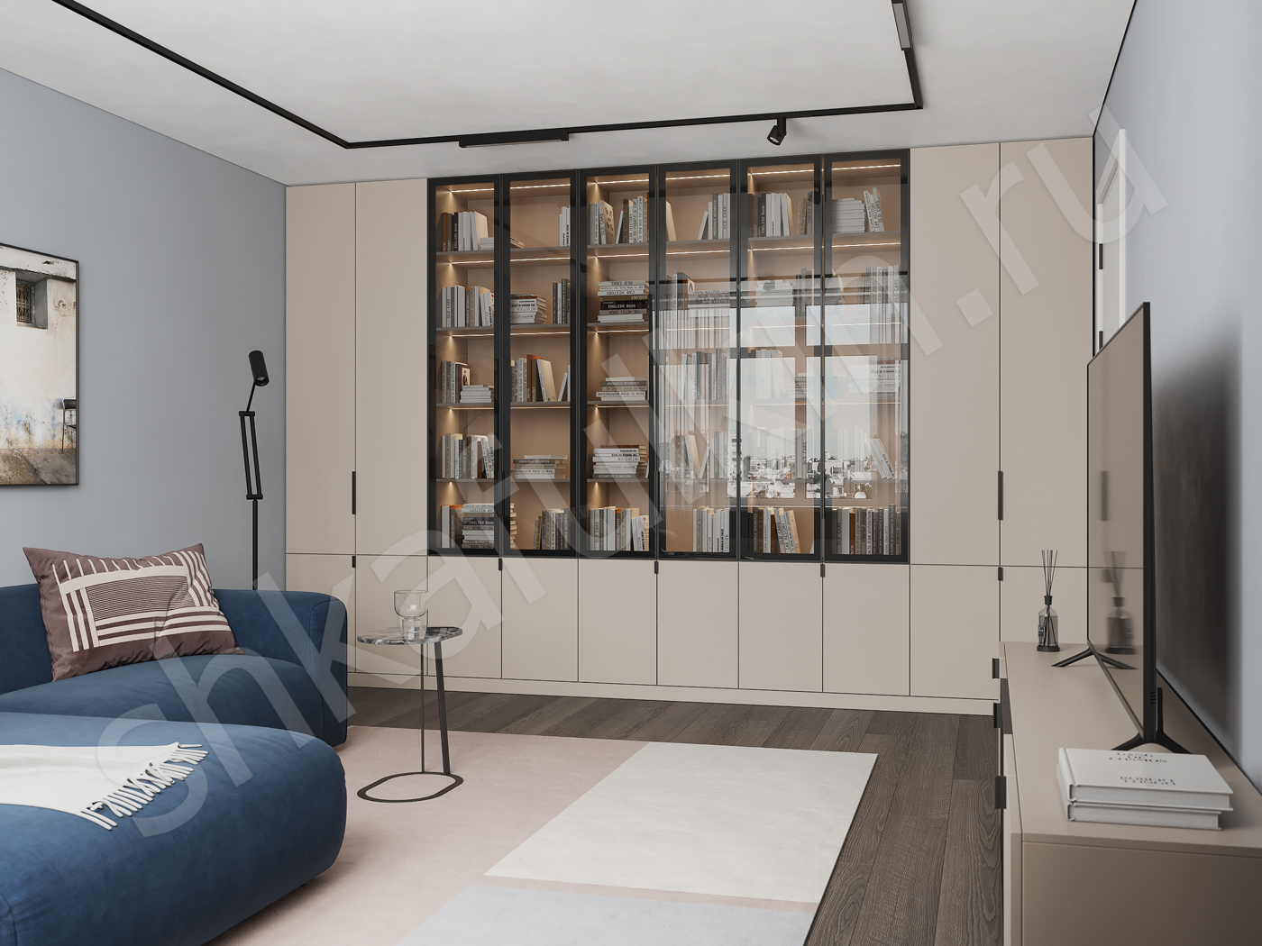 Фасады: МДФ крашенная по NCS; стекло в профиле ФБМ/ЛДСП Egger.