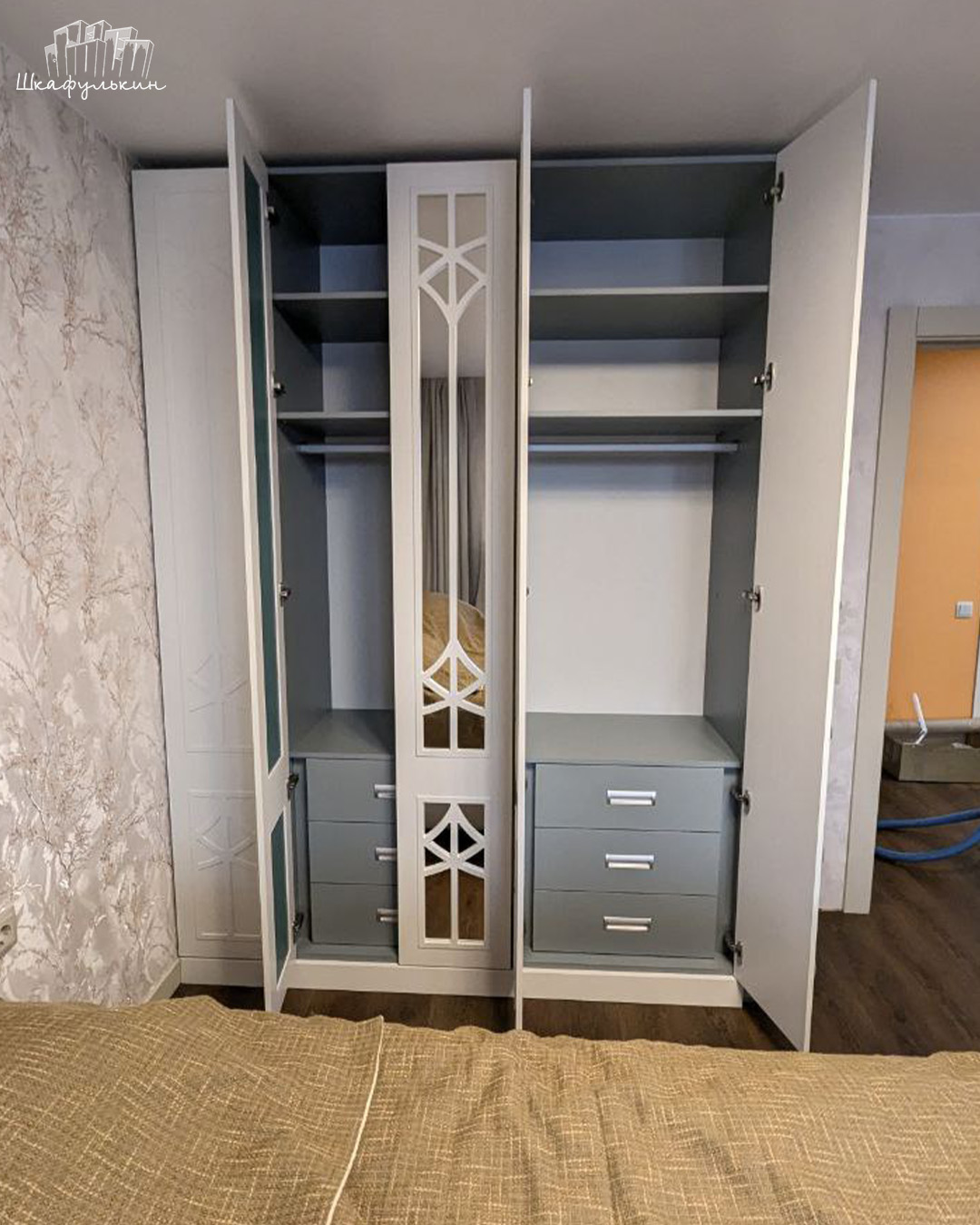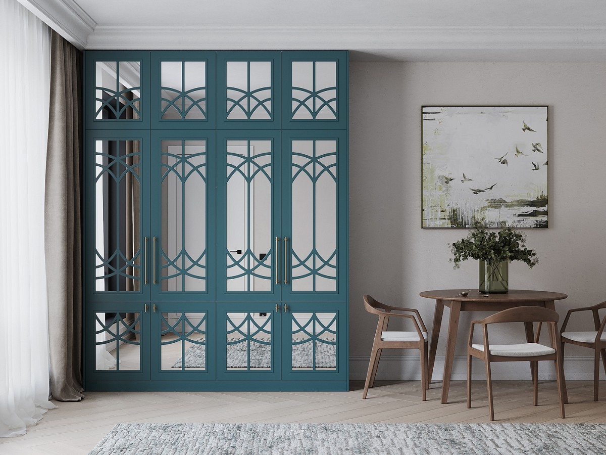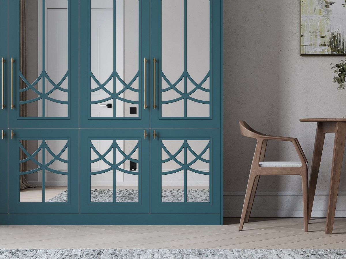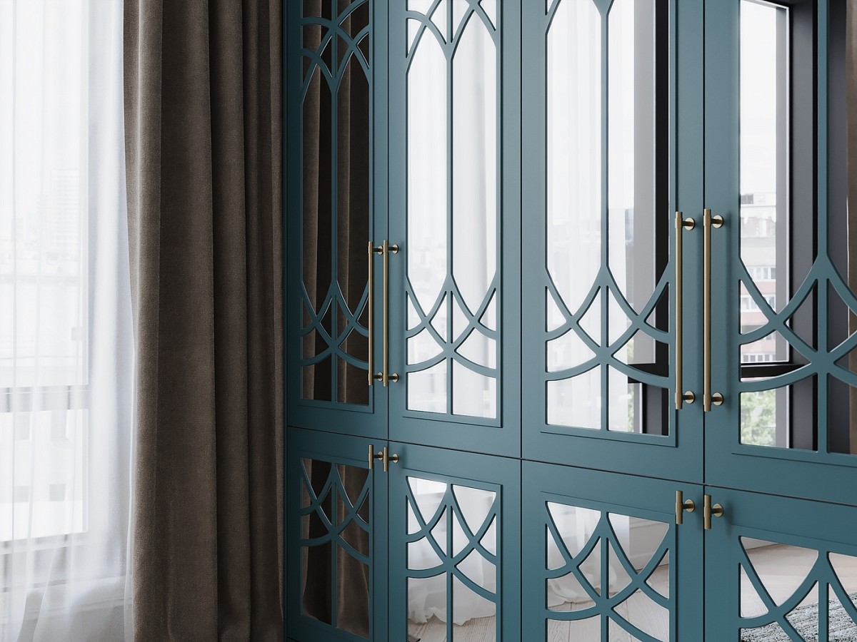 Фасады: МДФ с фрезеровкой, покрашенная по NCS с зеркальной вставкой.