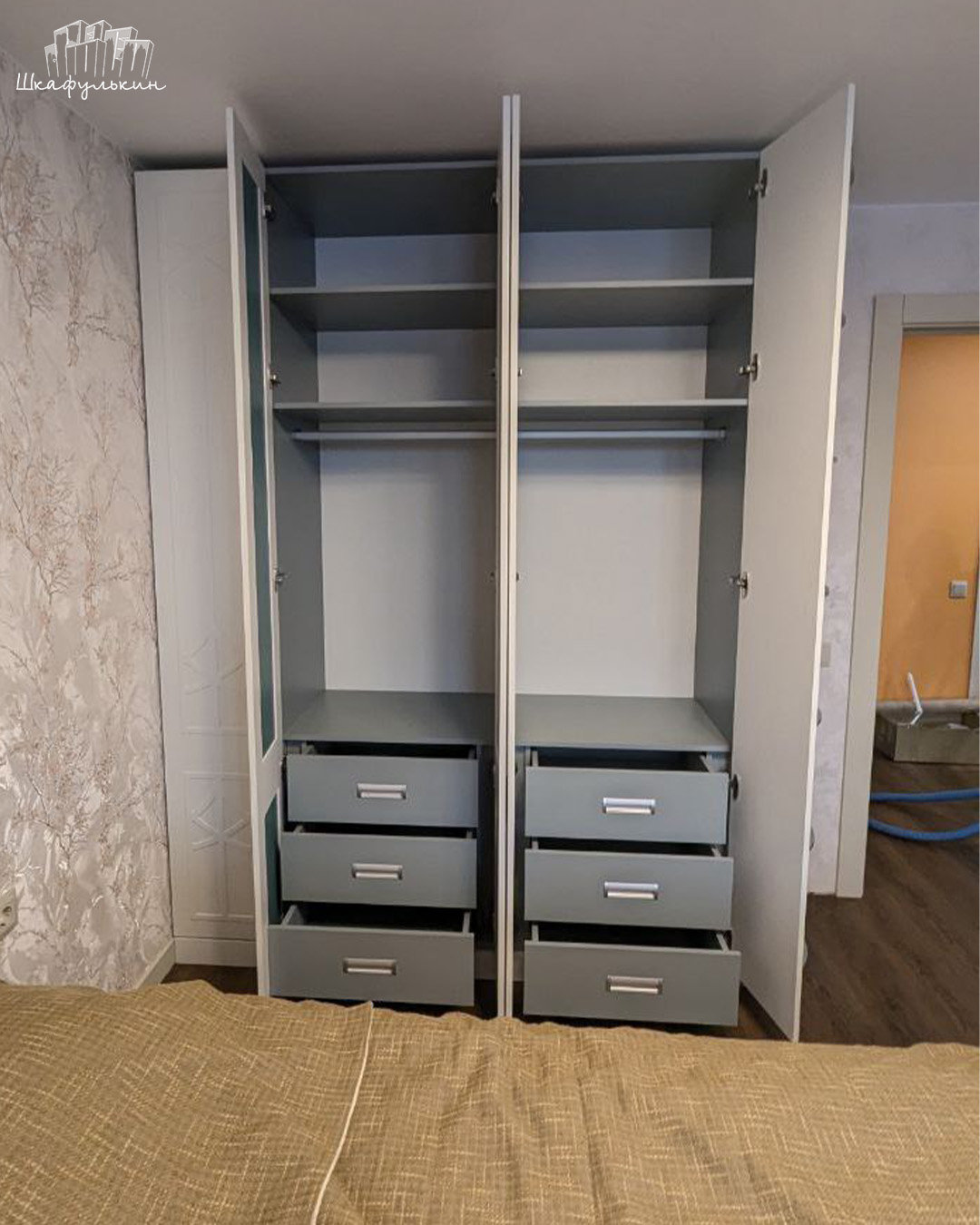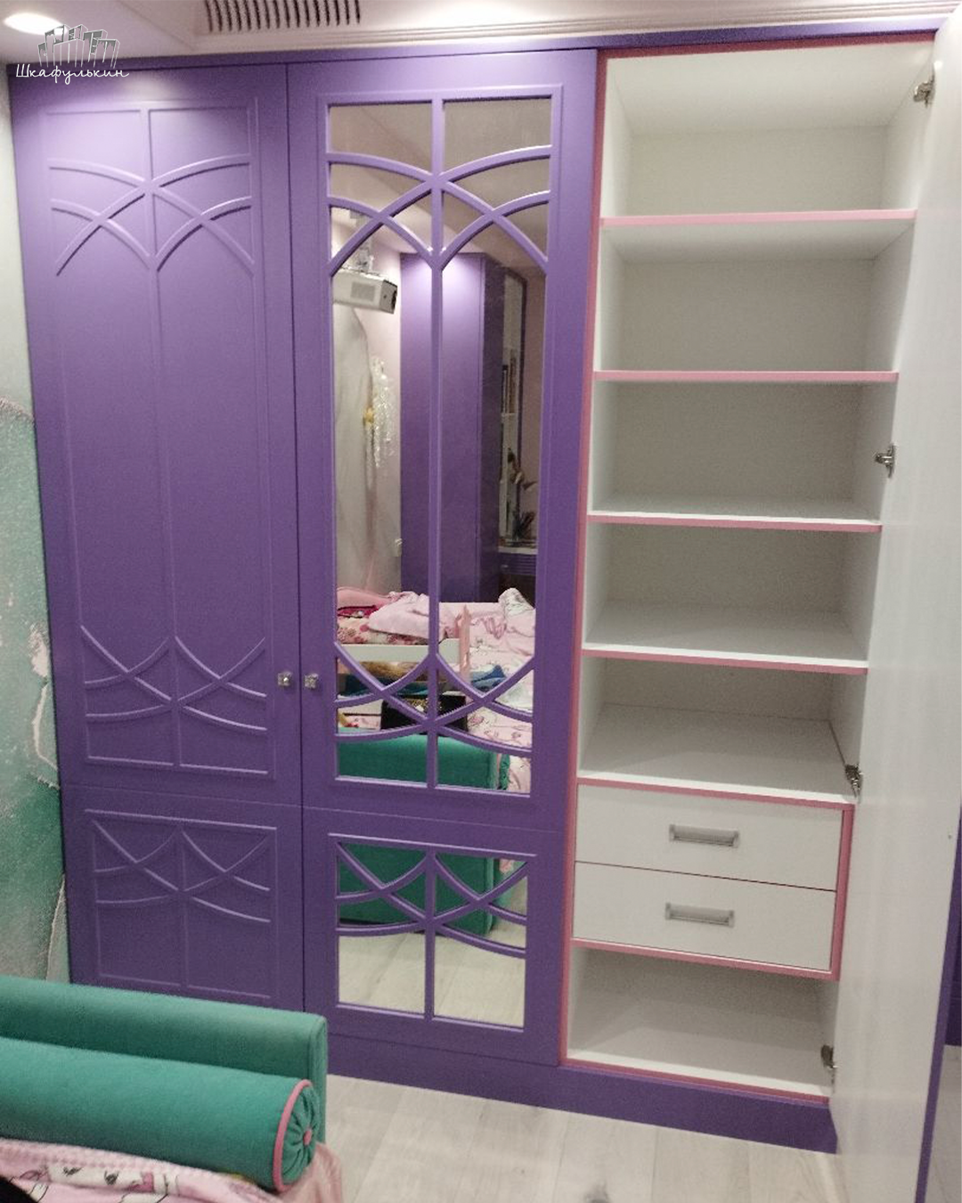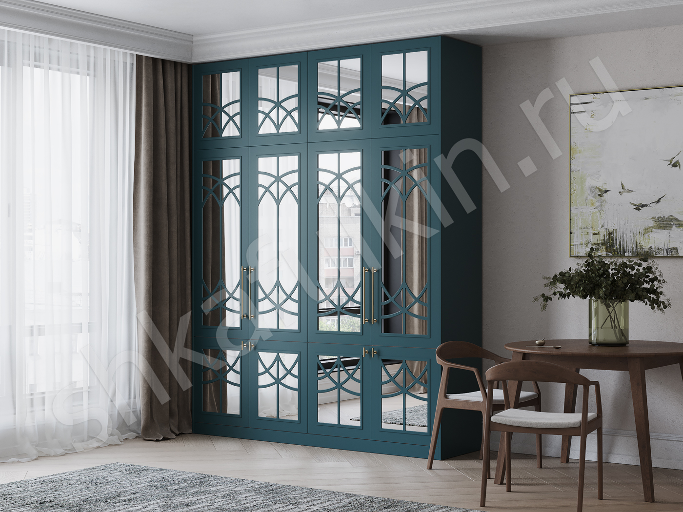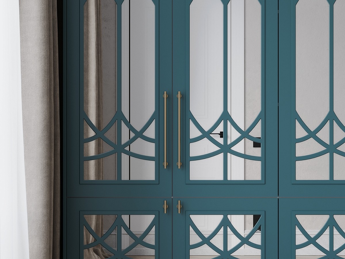 Фасады: МДФ с фрезеровкой, покрашенная по NCS с зеркальной вставкой.