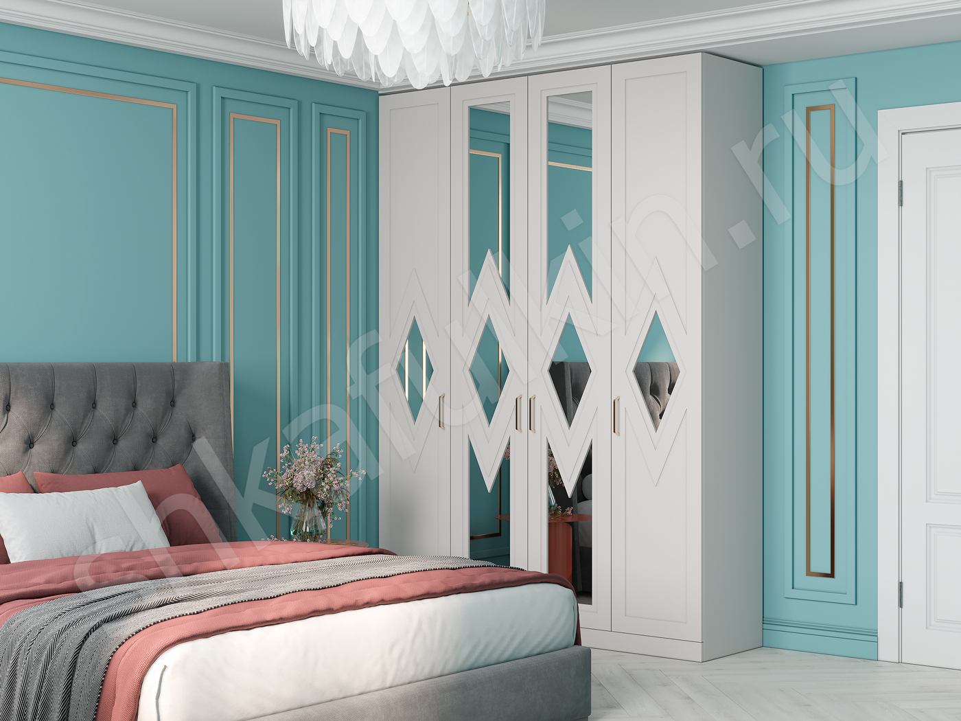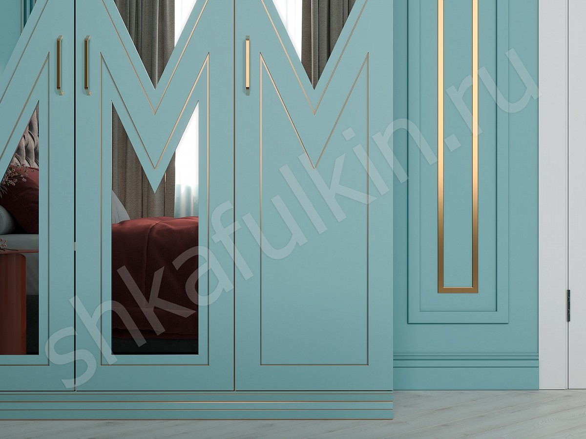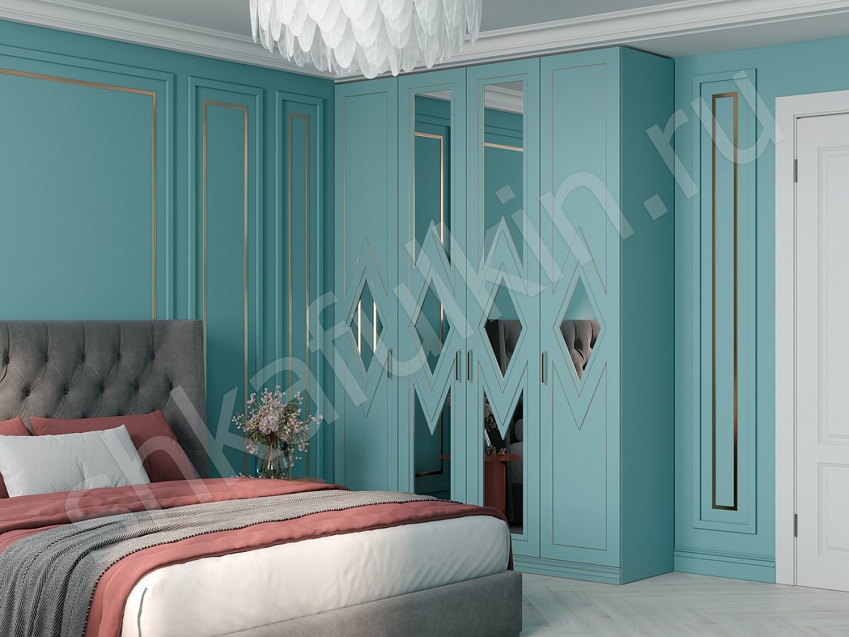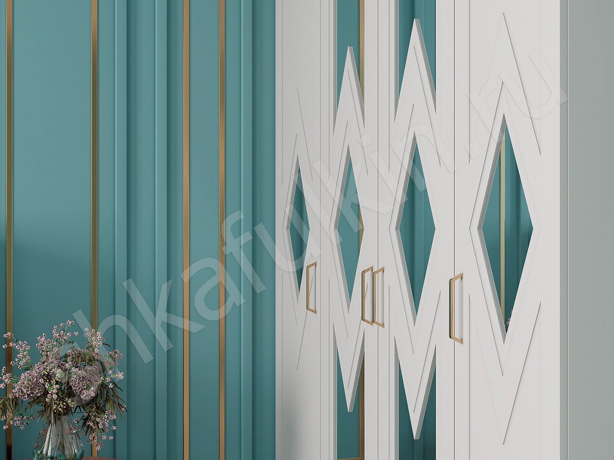 Фасады: МДФ покрашенный по NCS S 1502-Y с гравировкой и зеркалом.