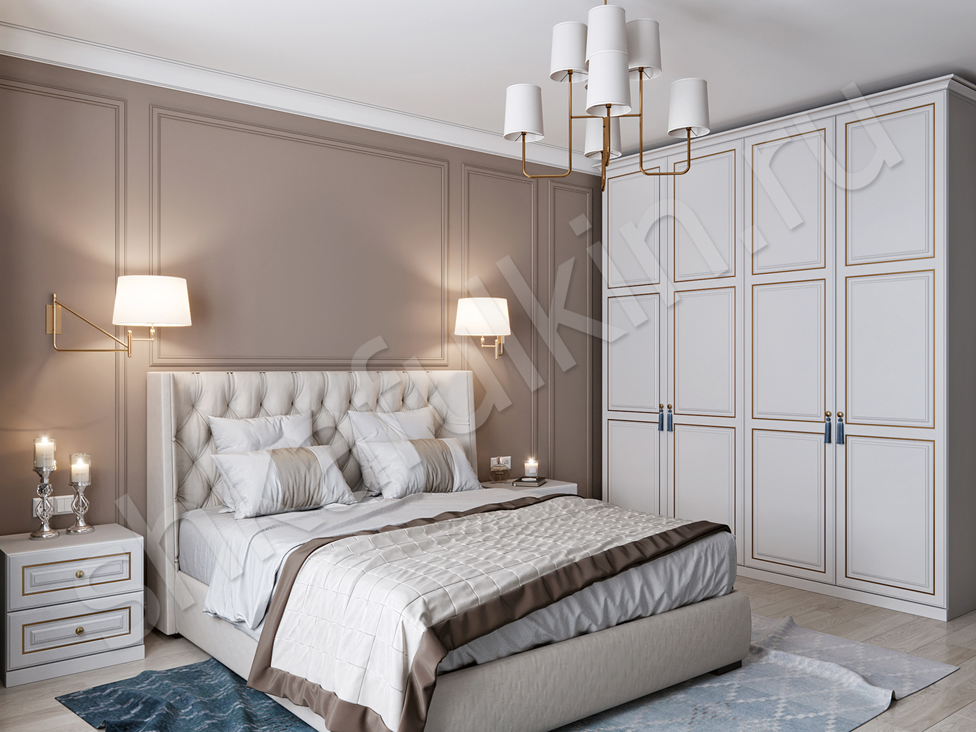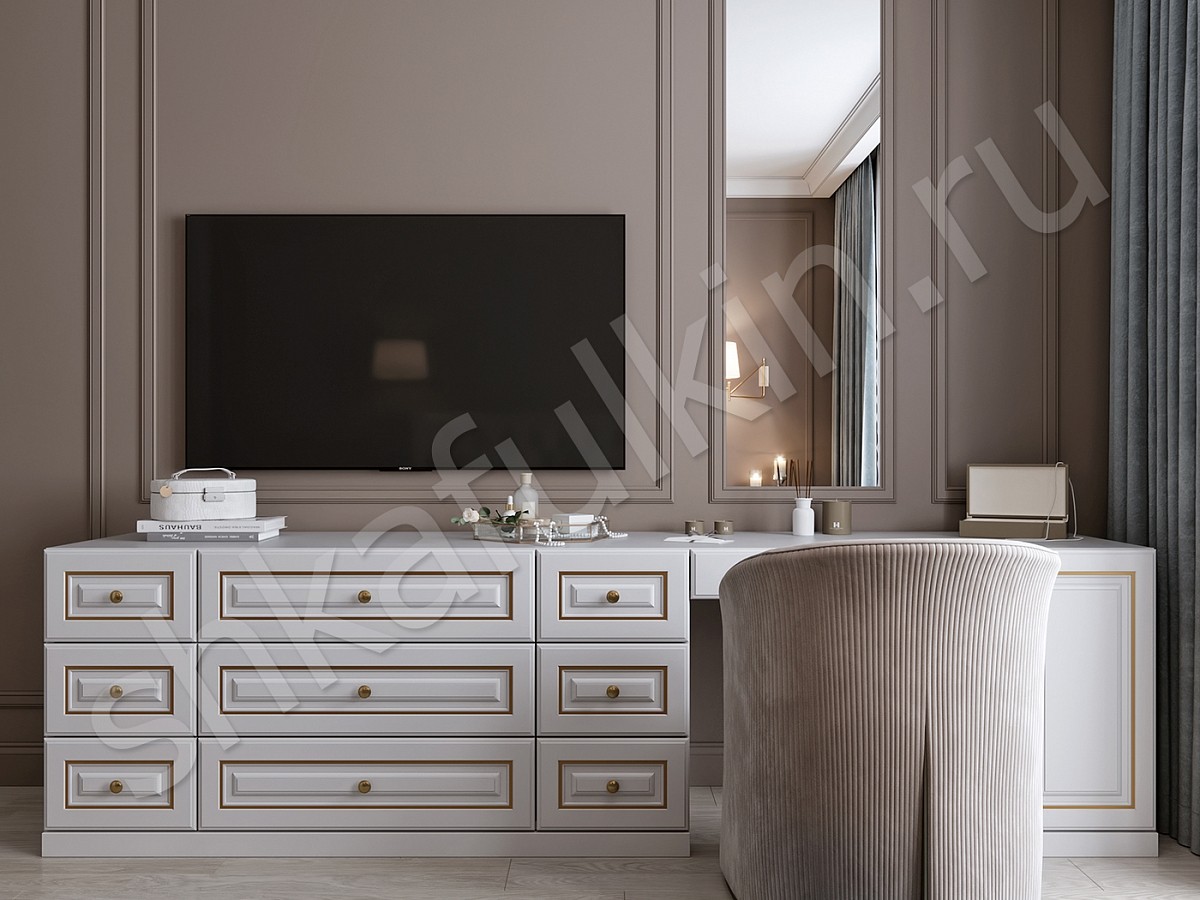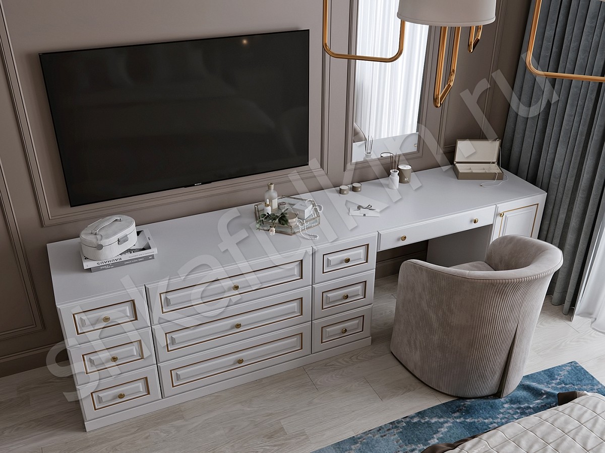 Каждый элемент мебели подумали до мелочей: шкаф с красивыми фасадами с золотой патиной в дуэте с функциональным внутренним наполнением, прикроватные тумбы с эксклюзивной фрезеровкой и многофункциональный туалетный столик, совмещенный с TV-зоной и вместительными комодами.