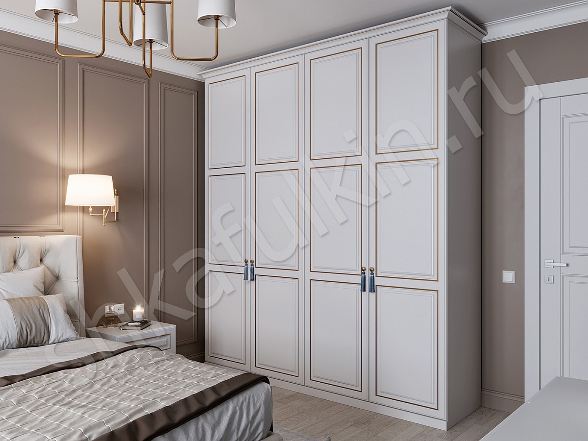 Фасады: МДФ (Сорренто) крашенные по RAL белого цвета с фрезеровкой и золотой патиной.