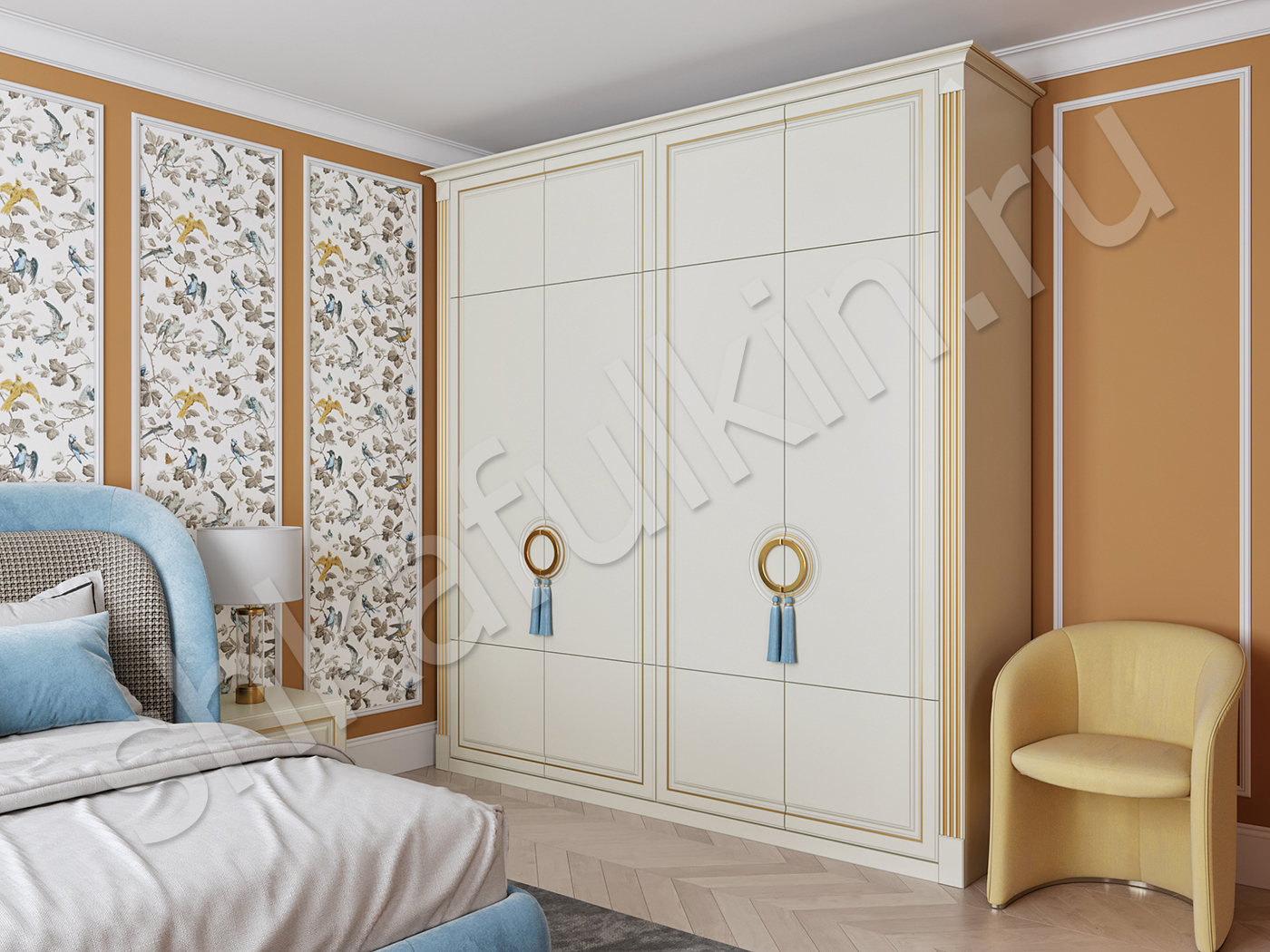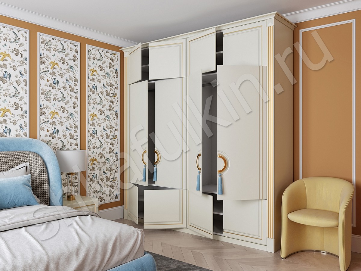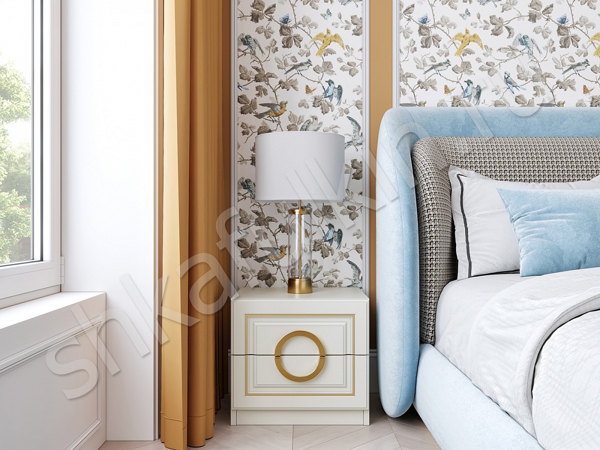Двери: МДФ крашенные по RAL 9018 с фрезеровкой и золотой патиной.