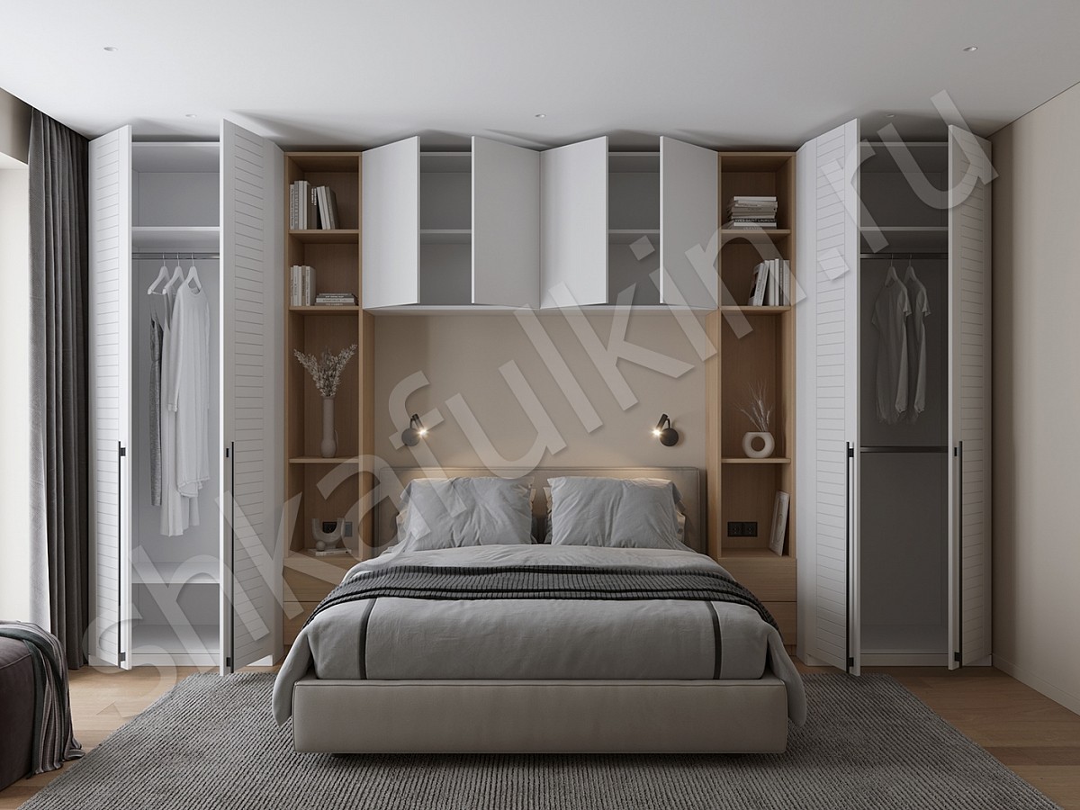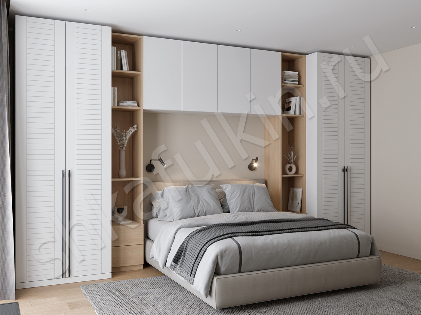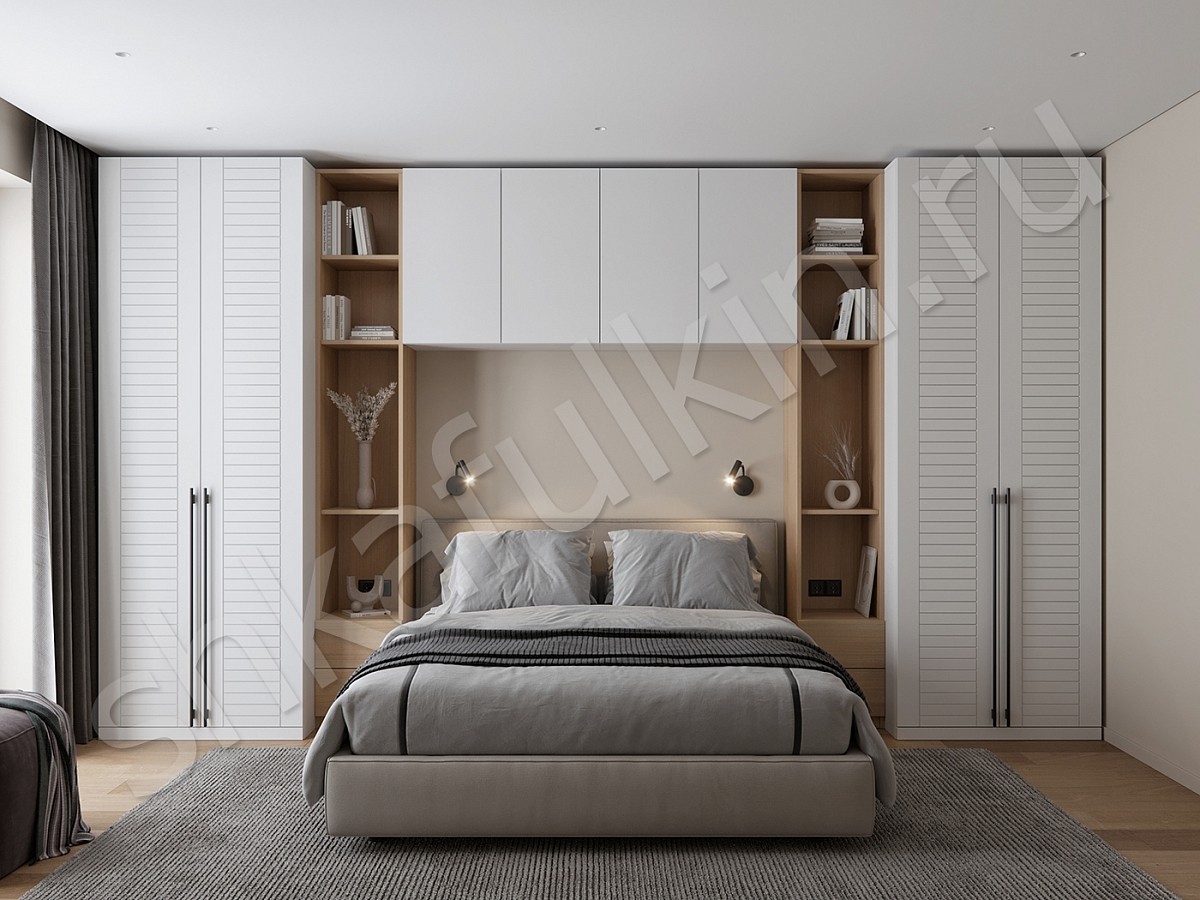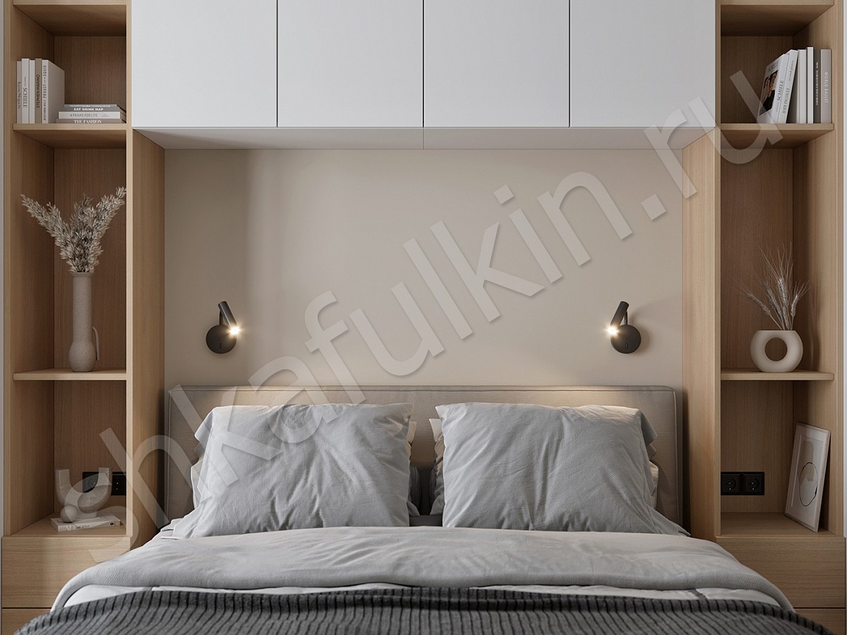 Шкафы над кроватью в интерьере спальни пользуются большим спросом, причем внутреннее наполнение и размеры отделений можно спроектировать по вашему усмотрению.