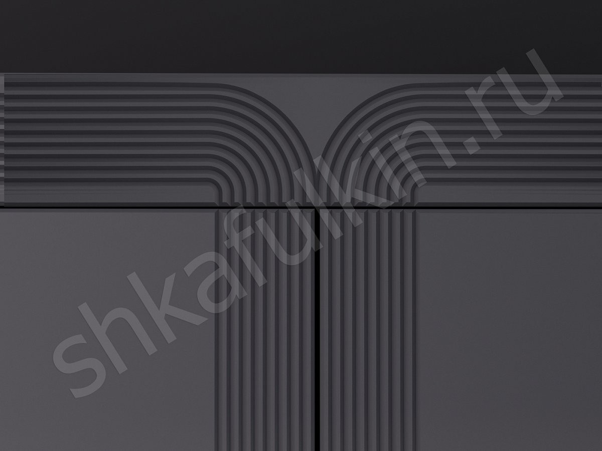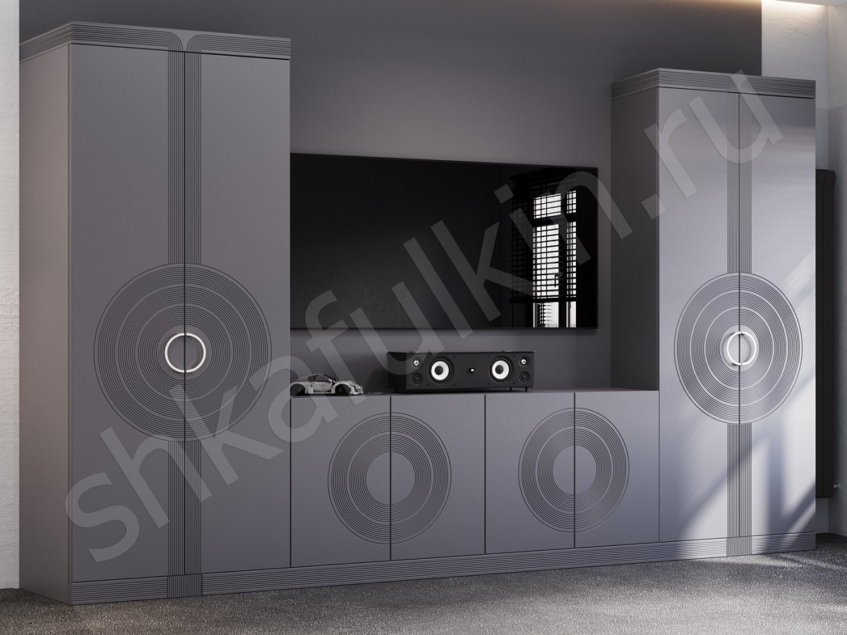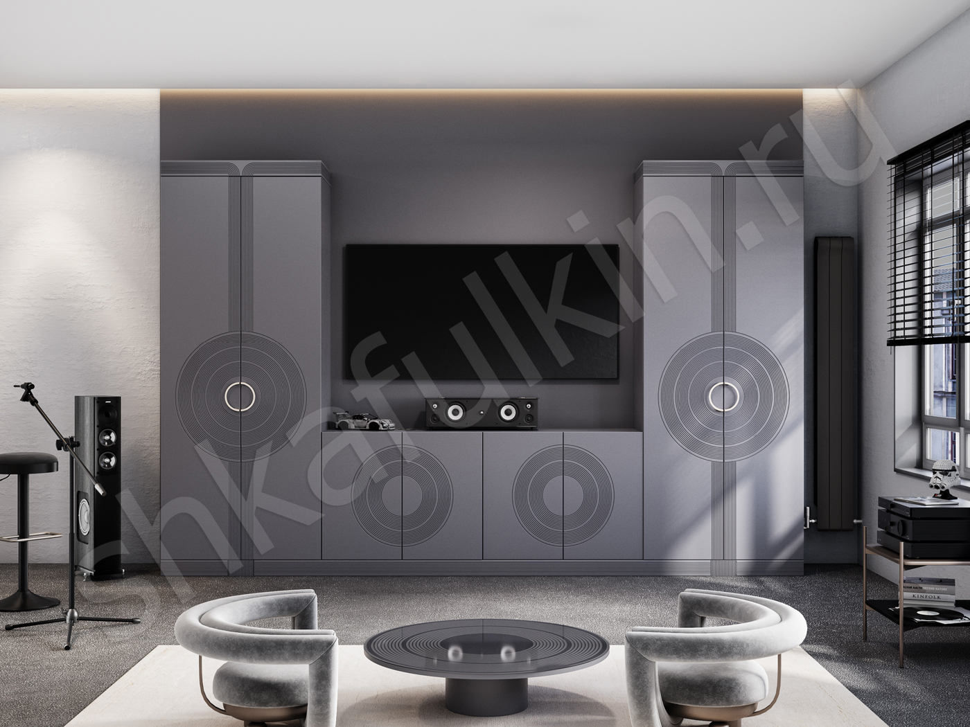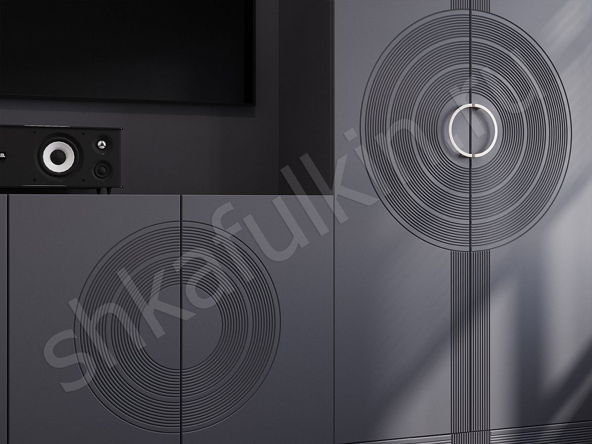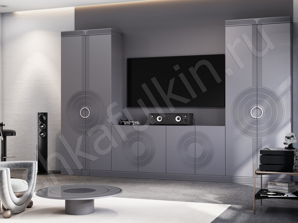 Глубокий графит NCS S 8000-N — не просто серый, а акустически нейтральный, сдержанно-элегантный фон, на котором выделяется музыкальное оборудование и личные коллекции. Узоры в виде концентрических колец — отсылка к виниловым пластинкам, динамикам, волнам звука. Это не декор. Это язык, понятный тем, кто слышит ритм в каждом движении. Центр — телевизор и аудиосистема (с местом под усилитель и колонки). Боковые шкафы — вместительные секции для инструментов, винила, техники и аксессуаров. Нижние модули — выдвижные ящики для мелочей, кабелей, нот. Встроенная подсветка — создаёт атмосферу студии: мягко, но точно. Интегрированные ручки и механизм от нажатия — никаких прерываний в потоке. Закруглённые углы и чистые линии — безопасно, современно, без лишнего. Матовая поверхность — не отражает свет, не царапается, не требует идеальной уборки.