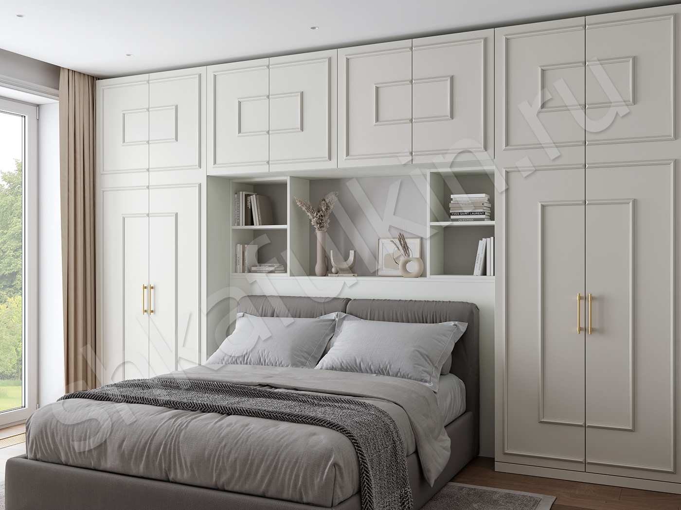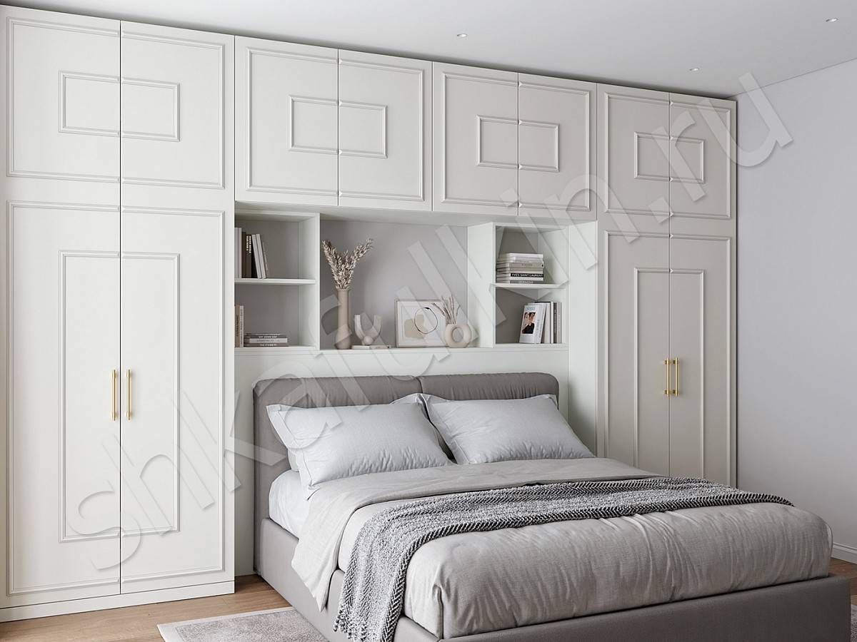 Шкаф над кроватью в интерьере спальни пользуется большим спросом, причем внутреннее наполнение и размеры отделений можно спроектировать по вашему усмотрению.