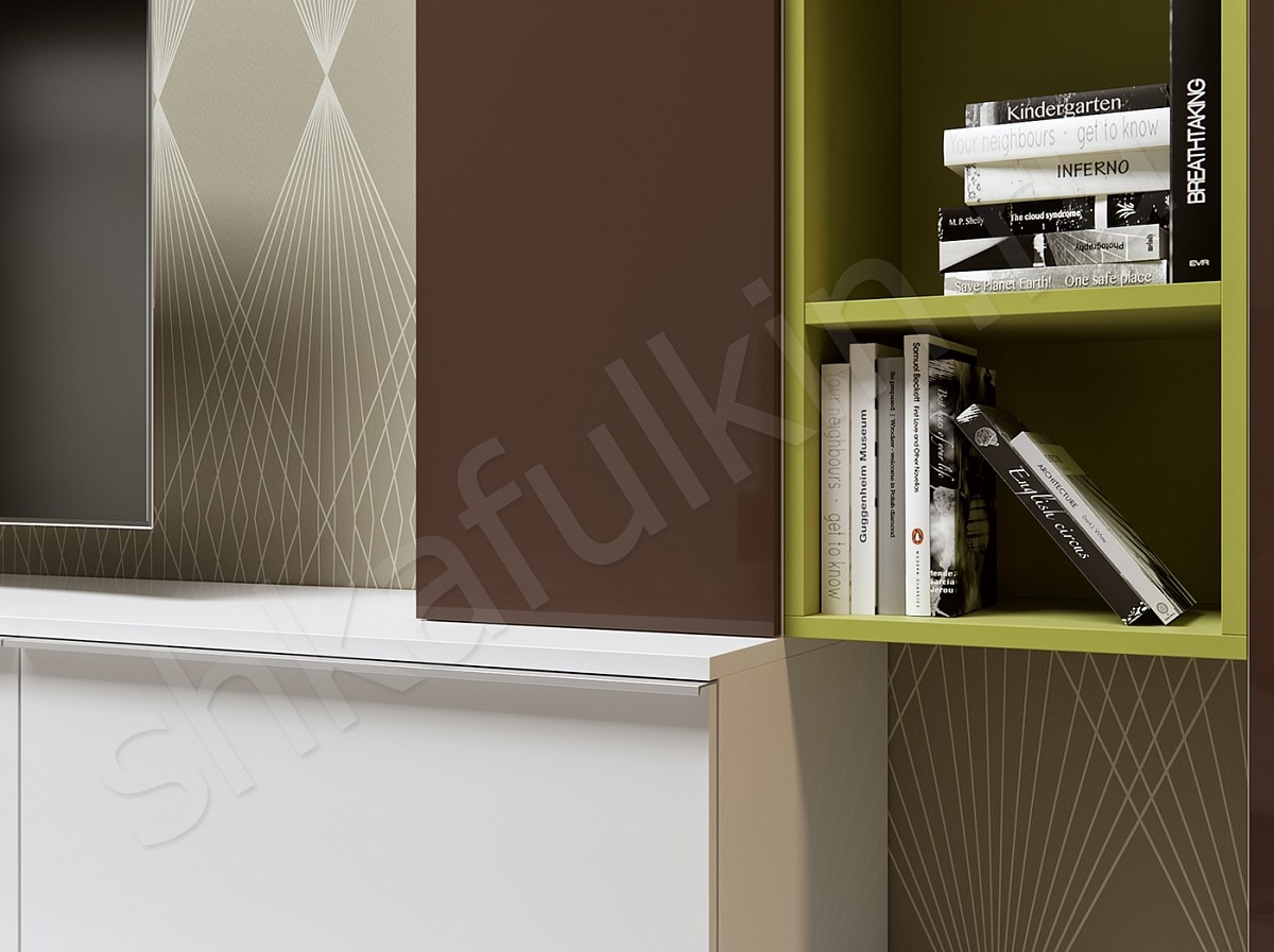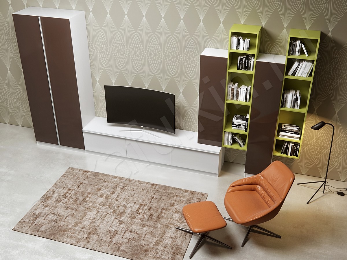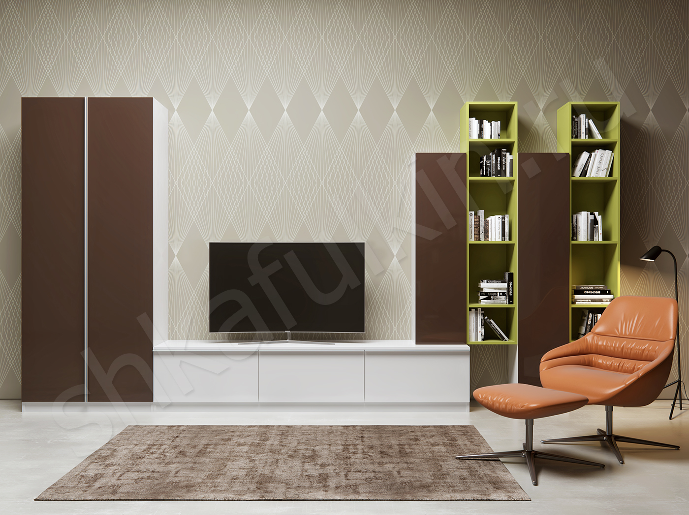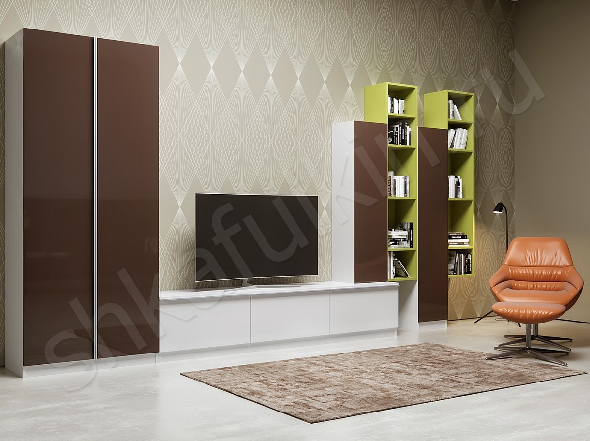 Стильная и элегантная стенка "Бушерон" сочетает в себе минималистские формы, удобство и функциональность. Глянцевая фактура стенки хорошо дополнит интерьер в стиле хай-тек, минимализм, арт-деко, поп-арт и даже лофт. Глянец – это ультрамодный тренд сегодня, поэтому если вы хотите создать современный интерьер гостиной, то без такой стенки вам не обойтись. Стоит уделить внимание сочетанию цветов глянцевых и фактурных фасадов. Вы можете скомбинировать любую композицию по цвету и наполнению, размещению полок и распашного шкафа. Сочетание коричневого цвета с зеленым является гармоничным сочетанием. Природный альянс коры дерева и листвы воспринимается человеческим глазом как естественный, поэтому часто используется при оформлении интерьеров. На фоне светлых стен отлично смотрится коричневая мебель, текстиль, рамки картин, плитка на камине, шторы на окнах. Интерьер в коричнево-зелёном цвете особенно популярен для гостиной и спальни в стиле модерн. Мебель стоит выделить насыщенными тонами, а помещение оформить в более лёгкой палитре.