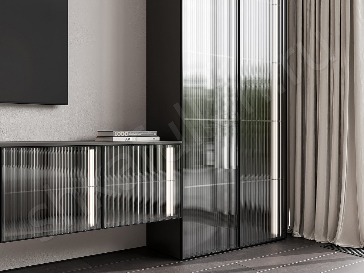 Фасады: алюминиевый профиль с рифленым стеклом Moru, цвет черный.
