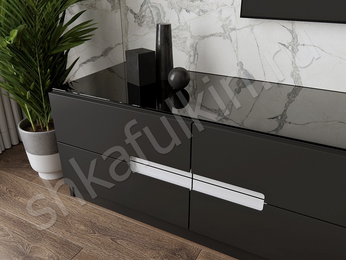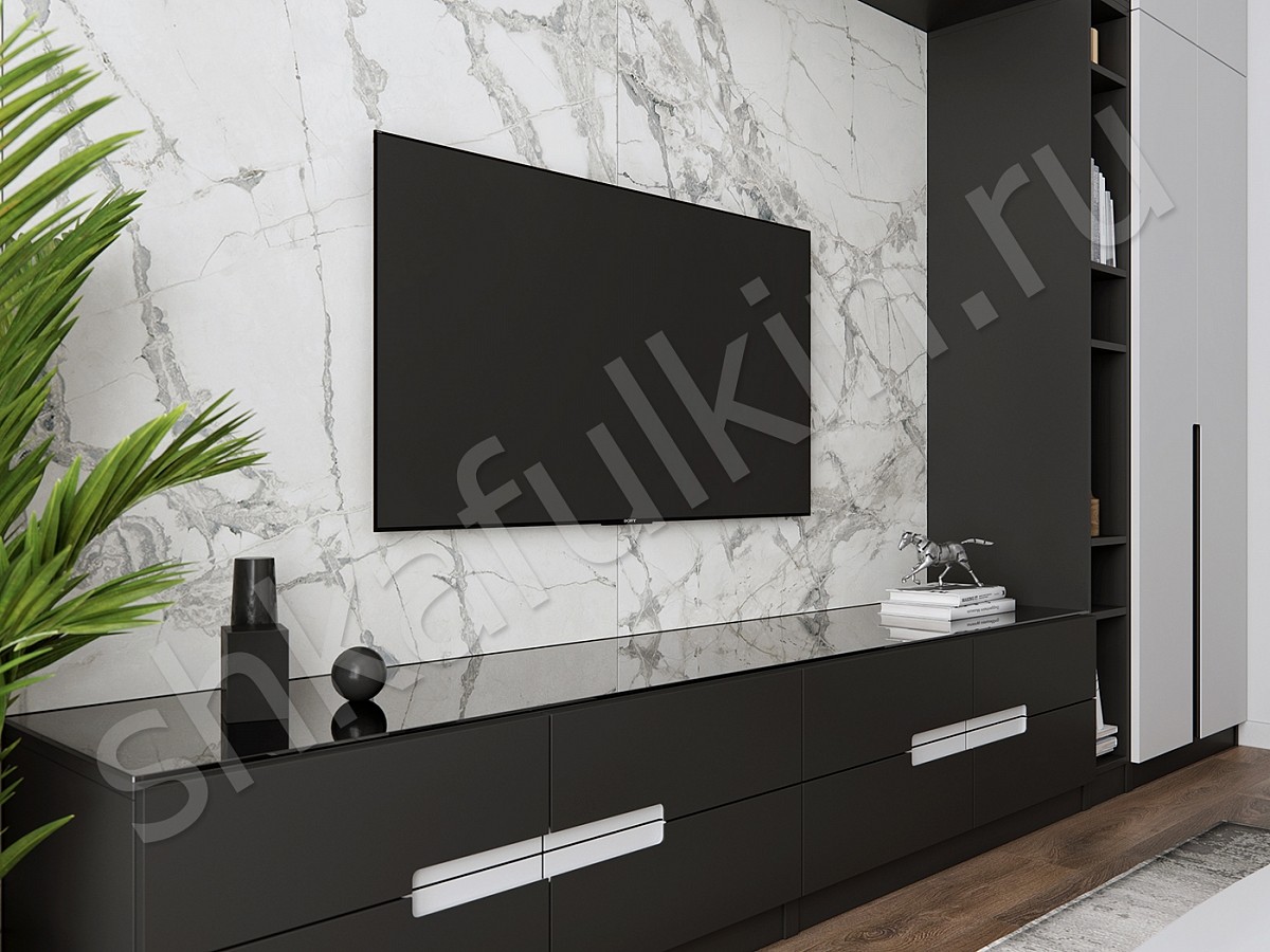 Современный распашной шкаф с местом под ТВ. Корпус выполнен из ЛДСП. Фасады крашеные по Ral с интегрированной ручкой.