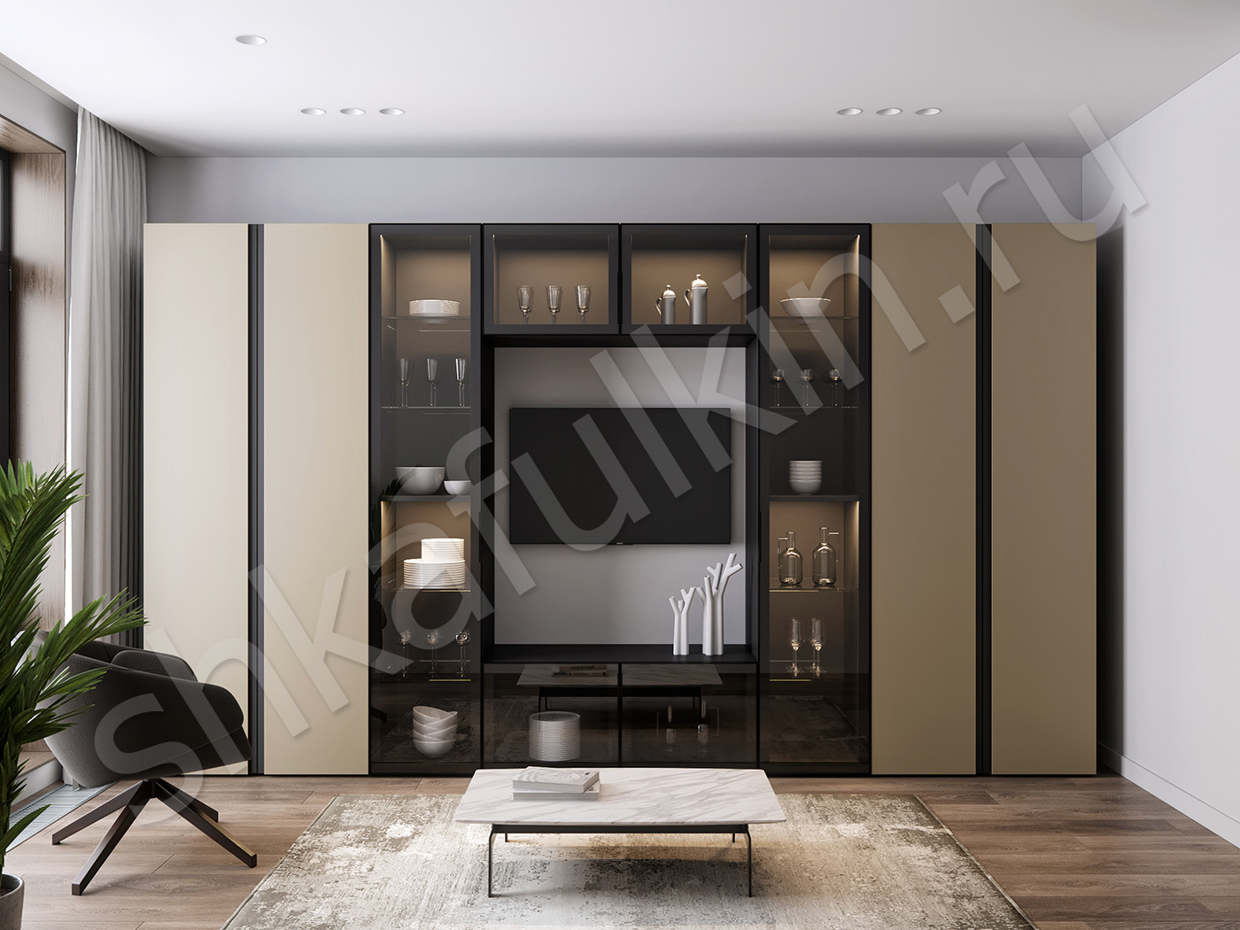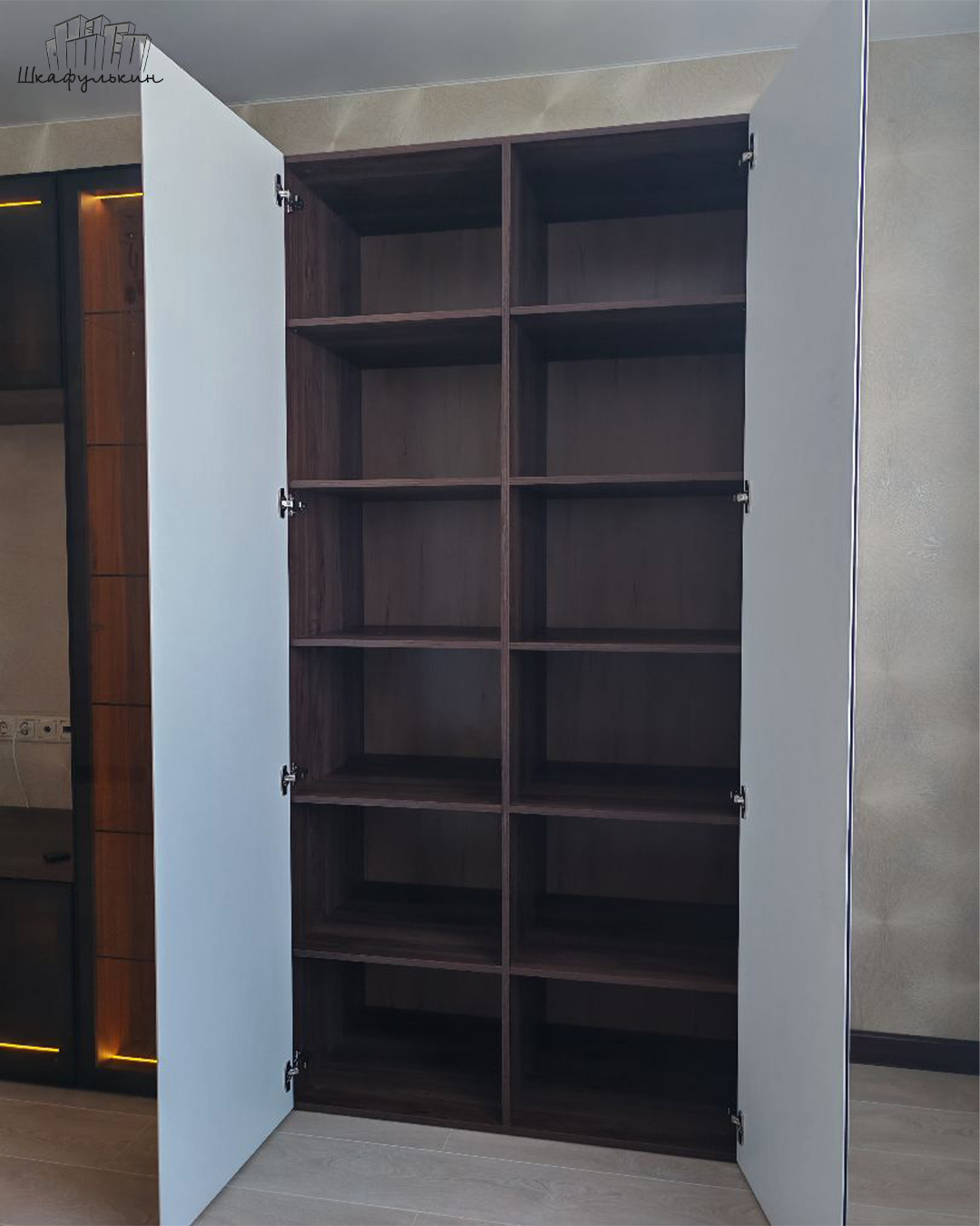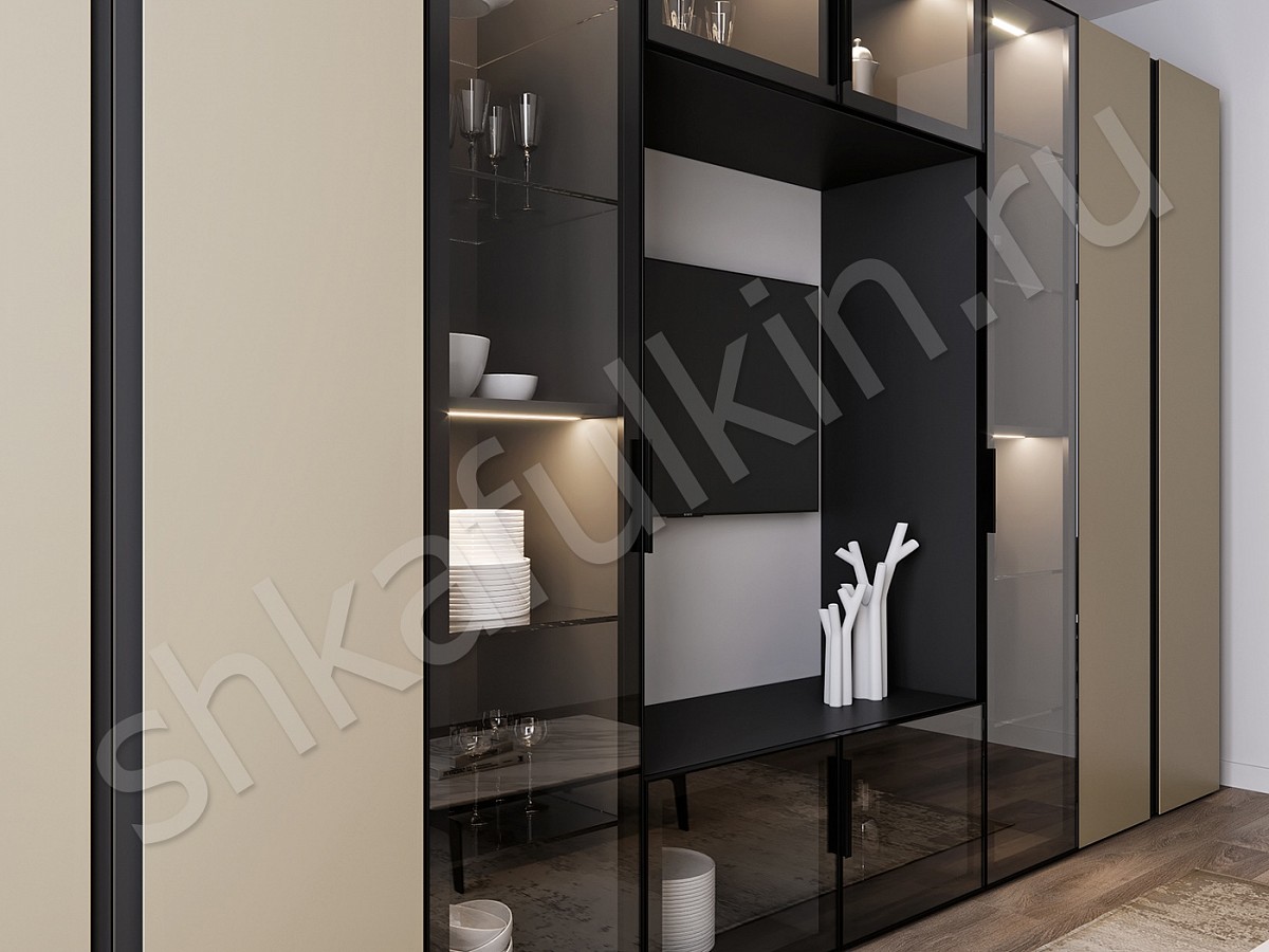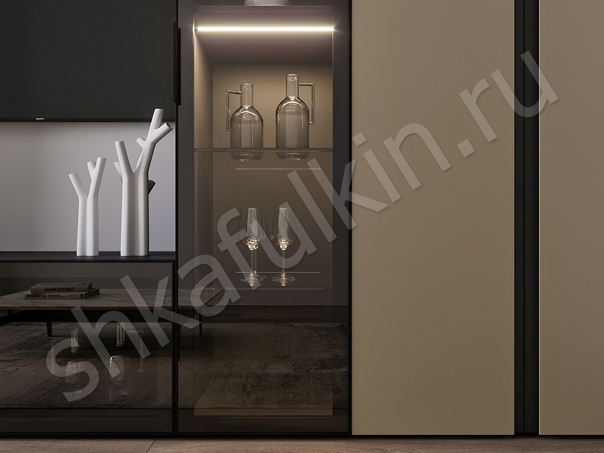 Двери: стекло, мдф с интегрированной ручкой, алюминиевый профиль, доводчики.