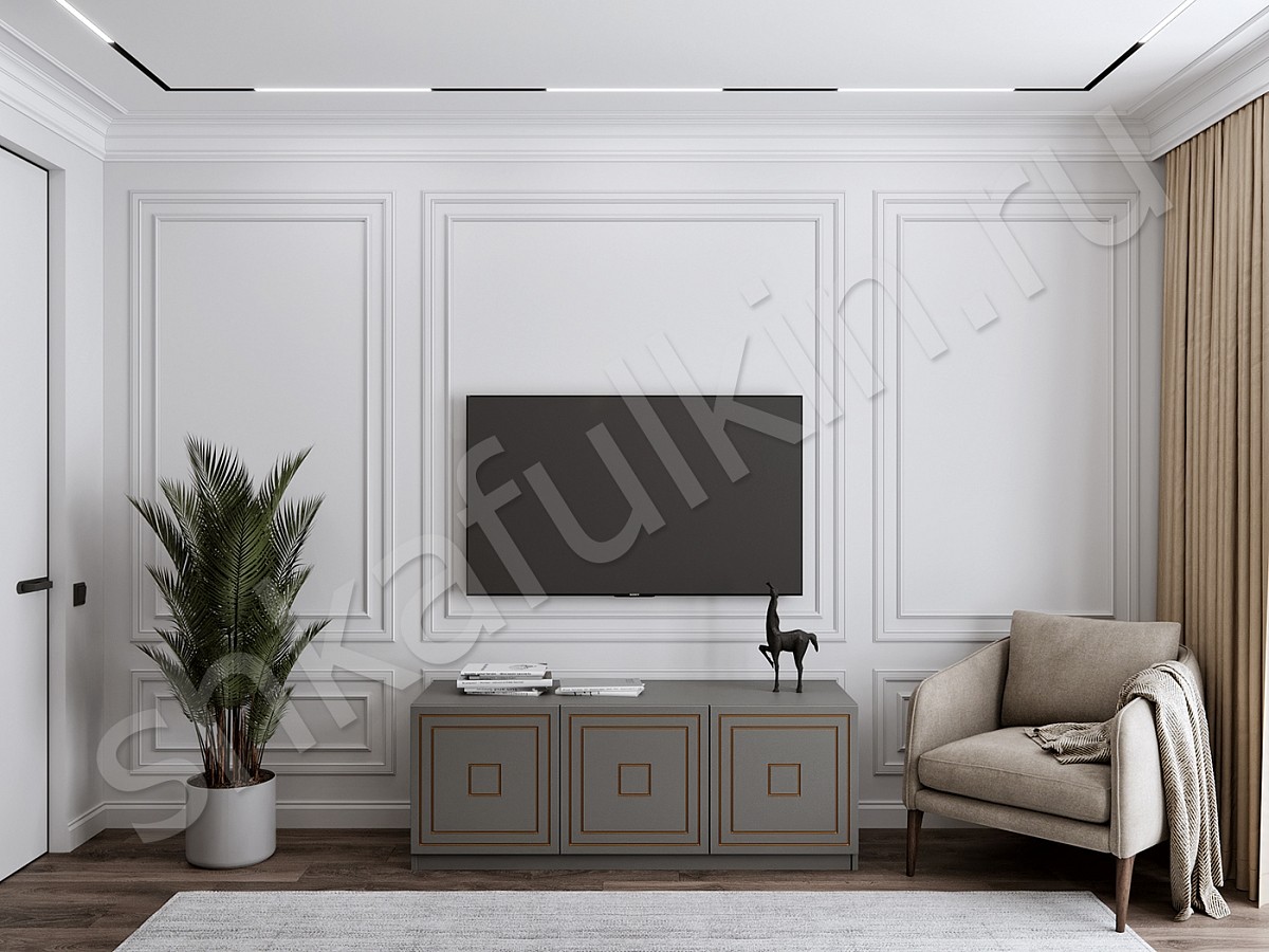 Фасады: МДФ крашенные по NCS S 6500-N (в цвет ЛДСП) с фрезеровкой, патина.