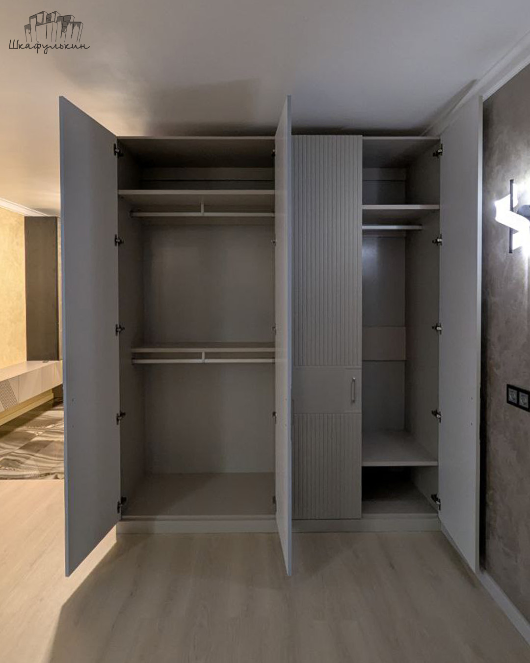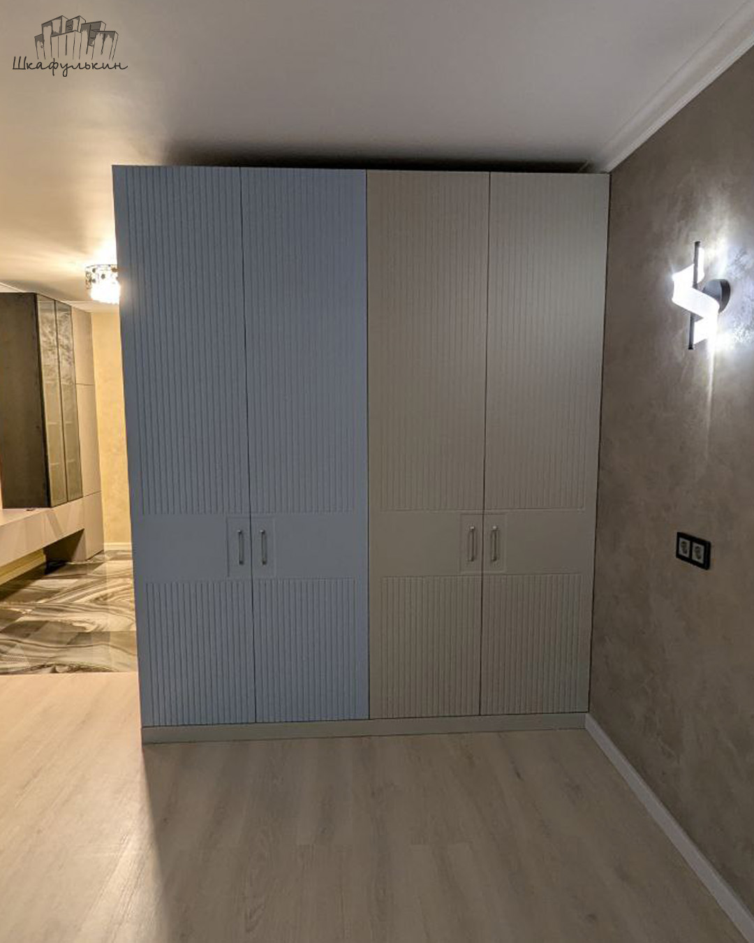 Прихожая «Альфредо» станет не только удобным местом для хранения верхней одежды, головных уборов и аксессуаров, но и ярким акцентом в вашем доме. Встроенная конструкция с четырьмя дверями позволяет эффективно использовать пространство, а золотая фурнитура добавляет интерьеру роскоши и изысканности.
