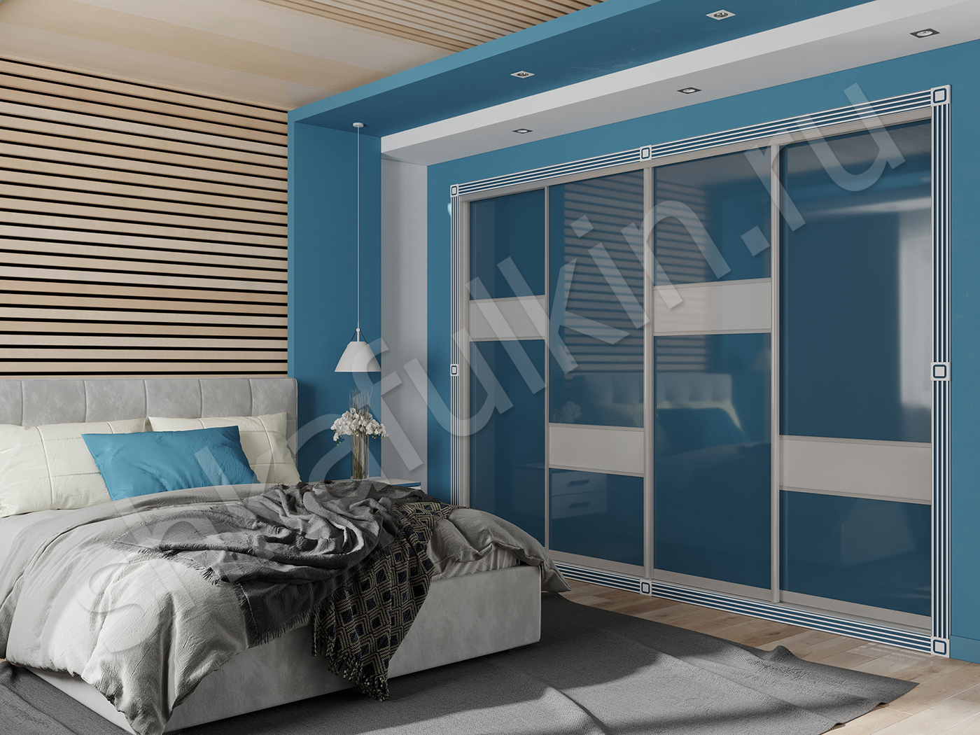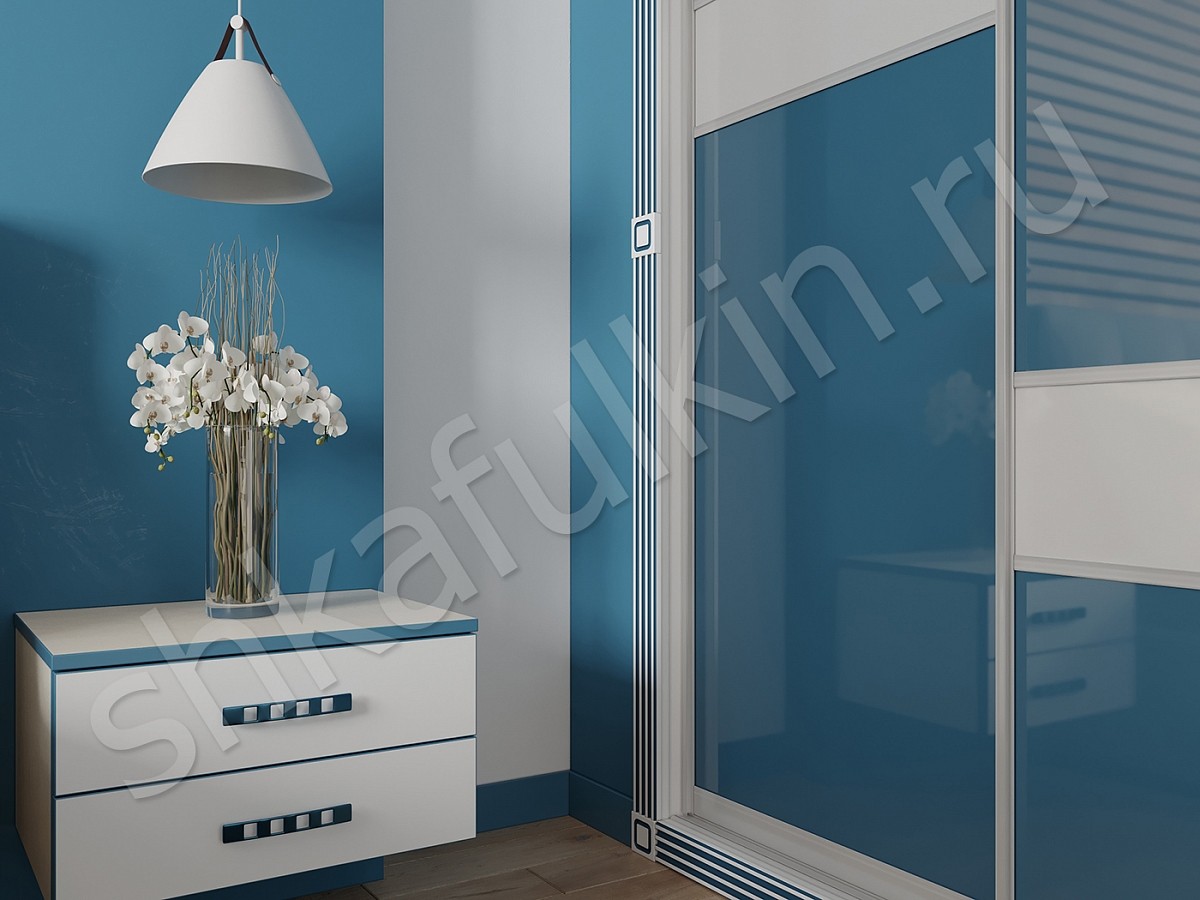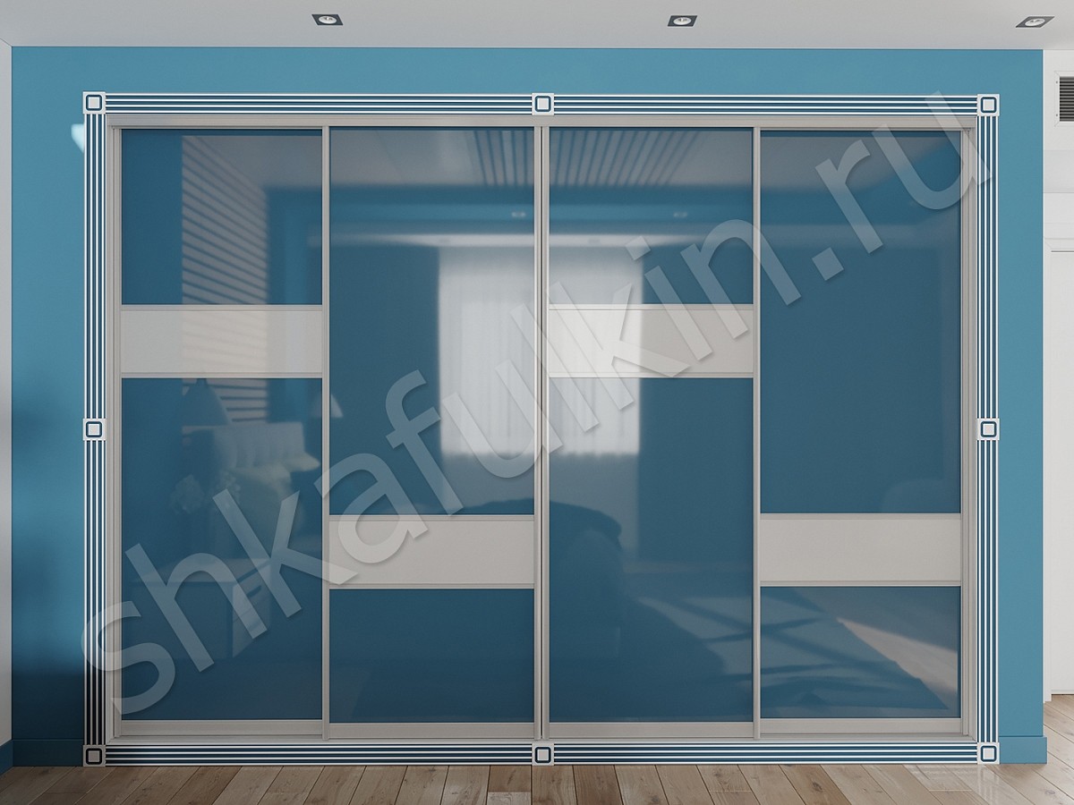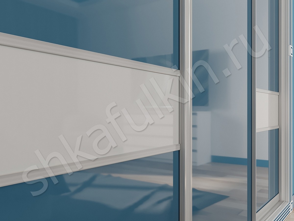 Двери: Стекло Лакобель синий с белыми вставками и пленкой безопасности, делители, тихоходные ролики, шлегель.