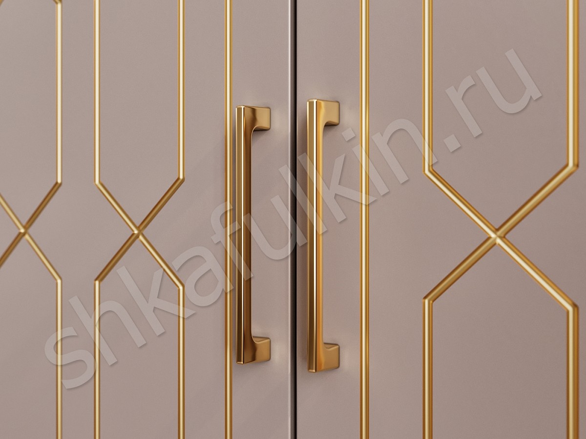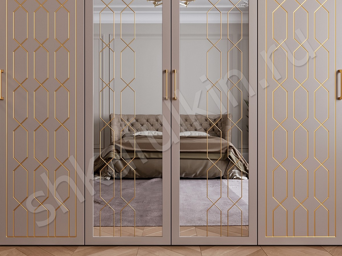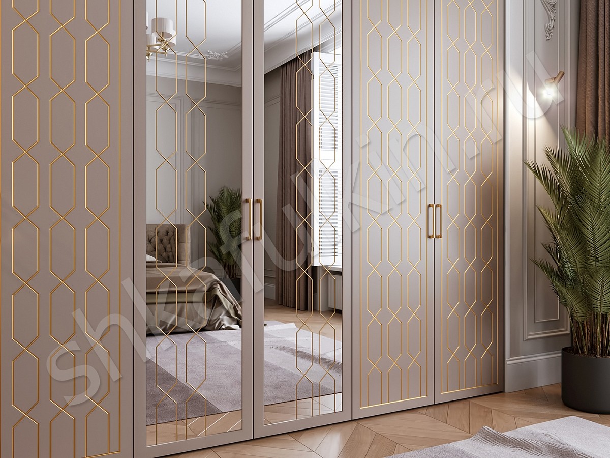 Двери: МДФ с фрезеровкой, зеркалом и витражным рисунком, крашенный по RAL 1019, патина.