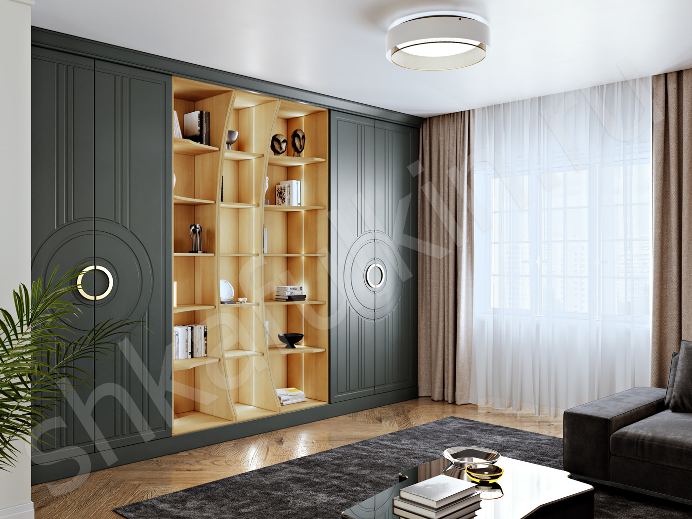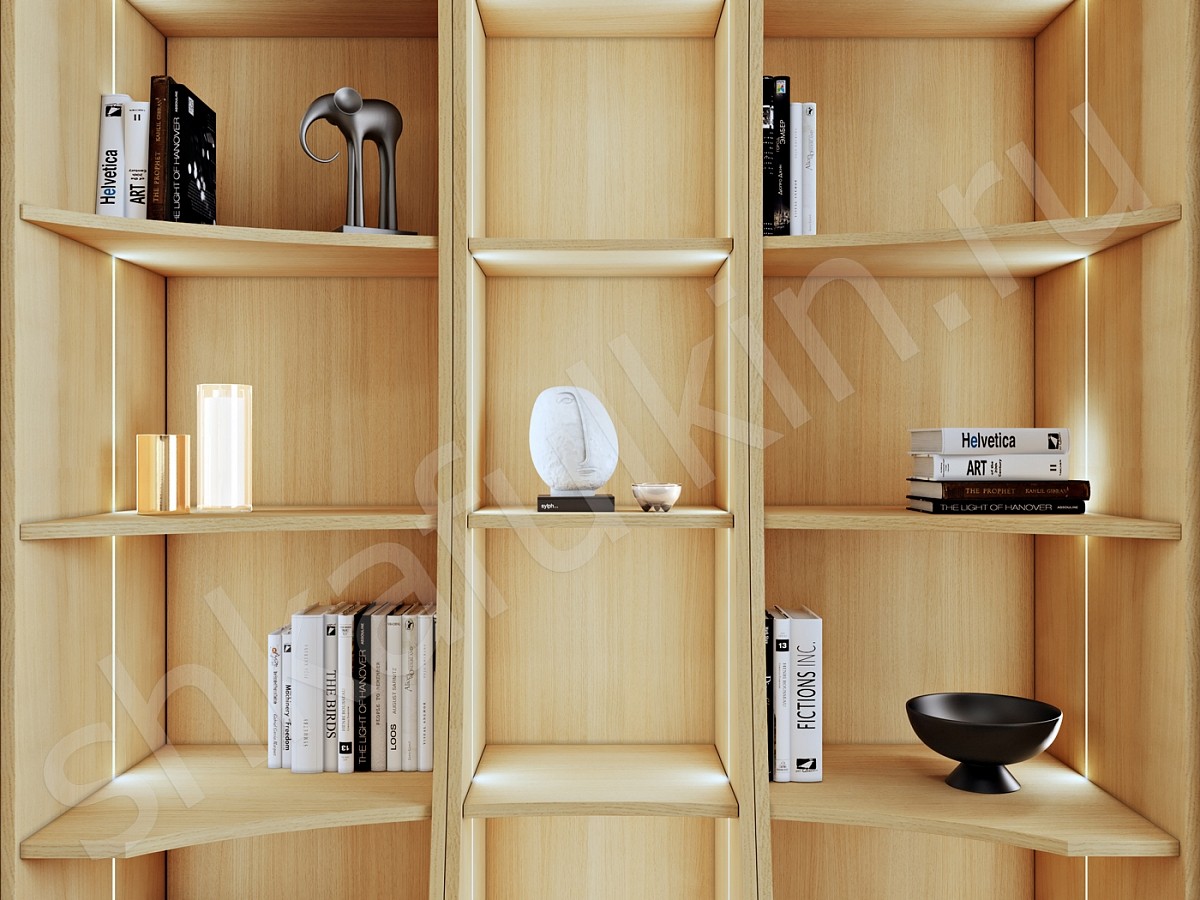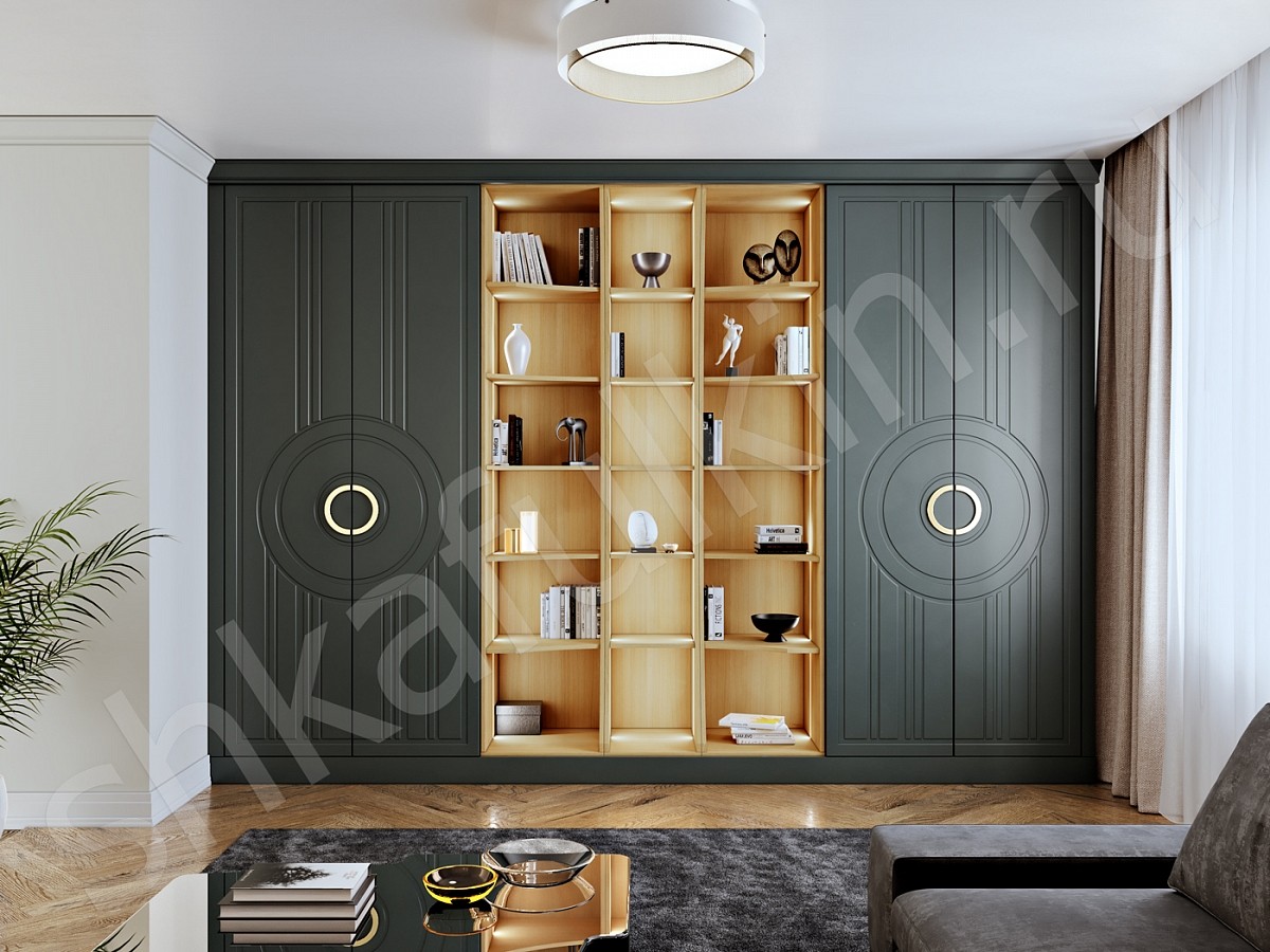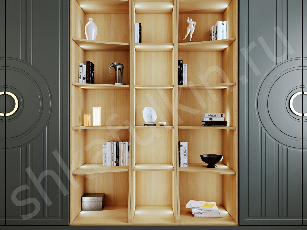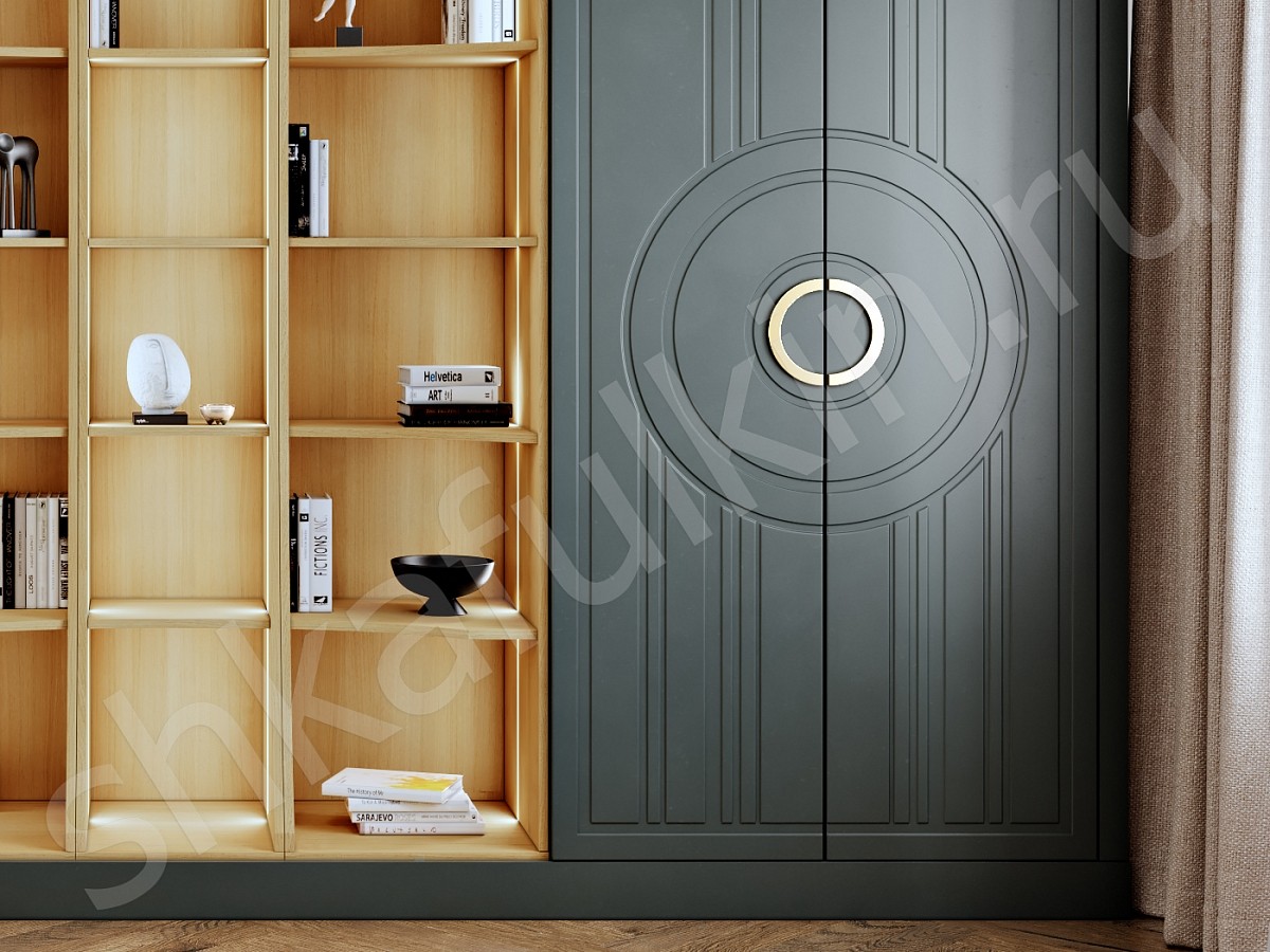 Шкаф в стиле неоклассика выполнен с фрезерованными фасадами и круглыми ручками, которые подчеркивают общую концепцию современных форм. Необычность этой модели не заканчивается, комбинация открытых и закрытых секций создают гармоничный дуэт, который не перегружает пространство и позволит расположить много интересного декора своих хозяев. Подсветка стеллажной секции с теплым свечением создают особую и очень уютную атмосферу в доме. Фасады можно изготовить в любой другом цвете палитр RAL или NCS.
