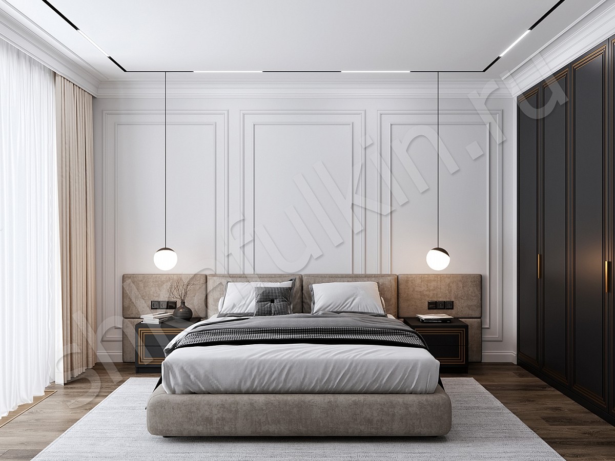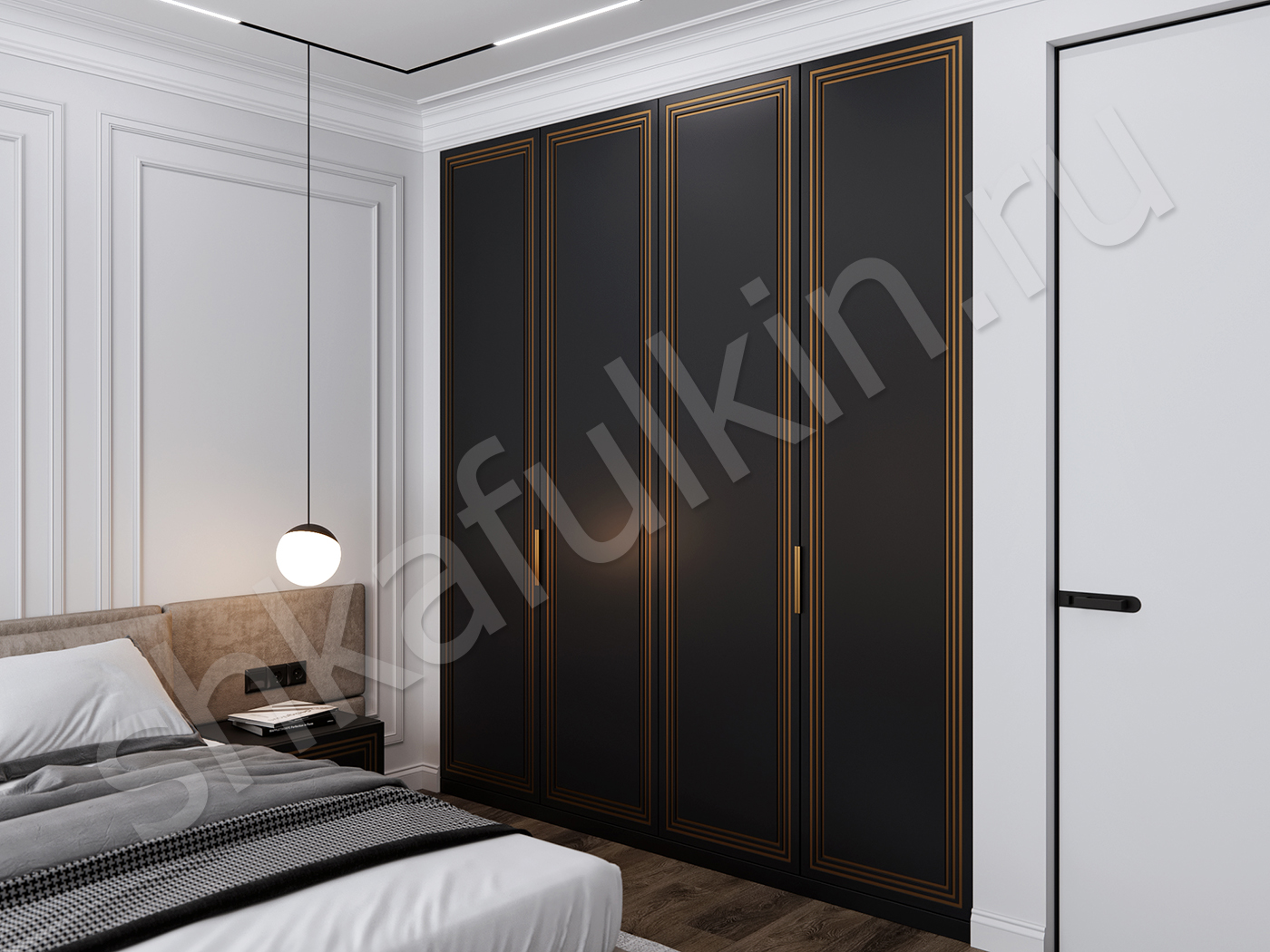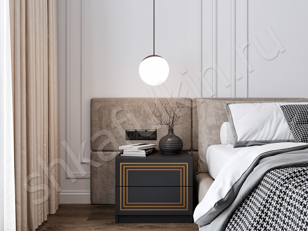 Черный цвет в интерьере любой спальни требует грамотного дополнения. Это должен быть дуэт с другим, сочетающимся цветом, либо трио, но никакой радуги.Фасады: из МДФ крашенные по RAL черного цвета с фрезеровкой, патина.