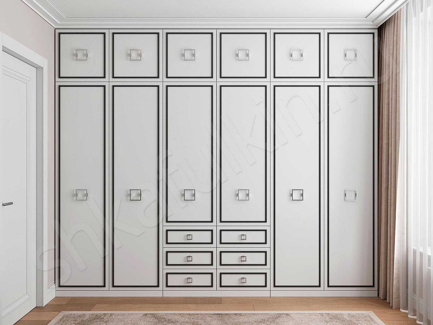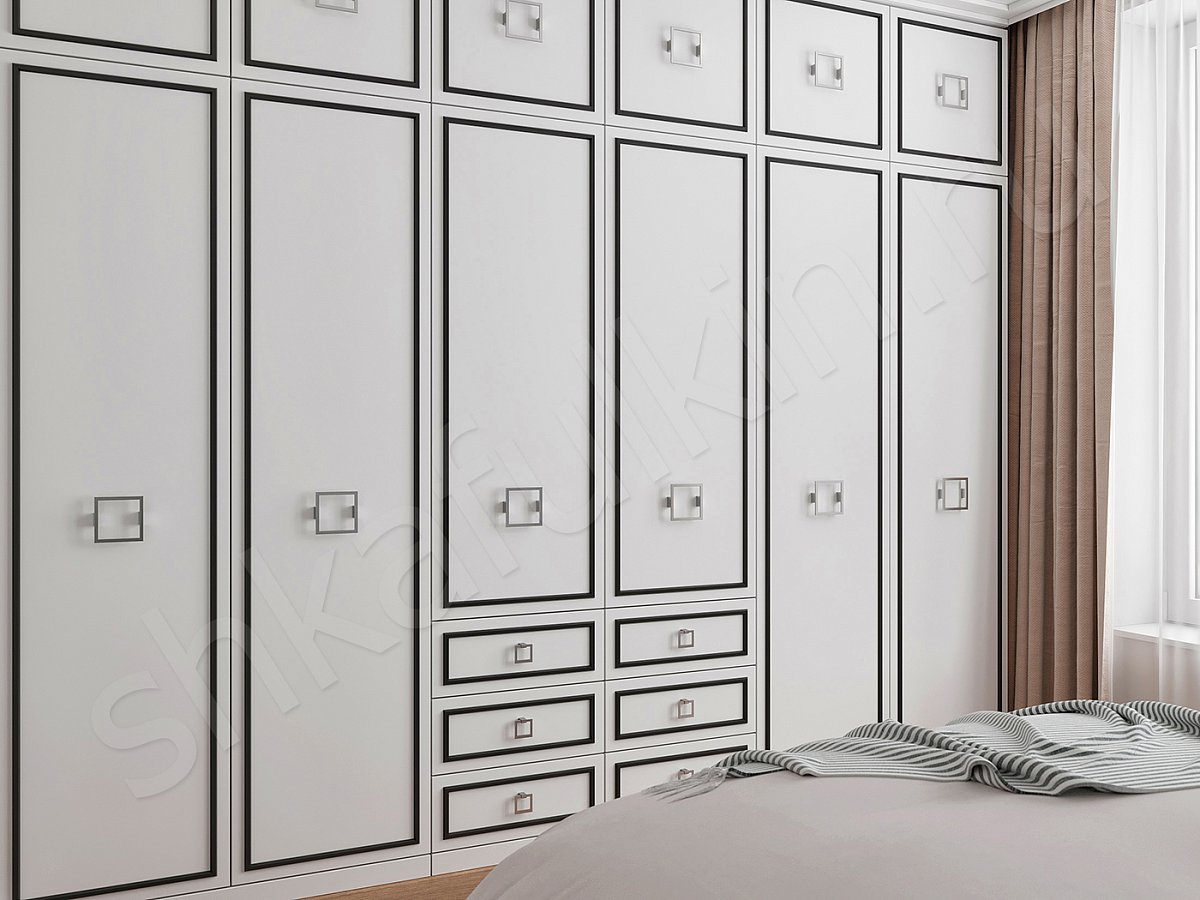 Контрастное сочетание чёрного и белого — визитная карточка ар-деко, но очень часто встречается в классических интерьерах. Шкаф "Дантес" с белыми фасадами и черными правильными линиями отличается строгостью, лаконичностью и элегантностью.