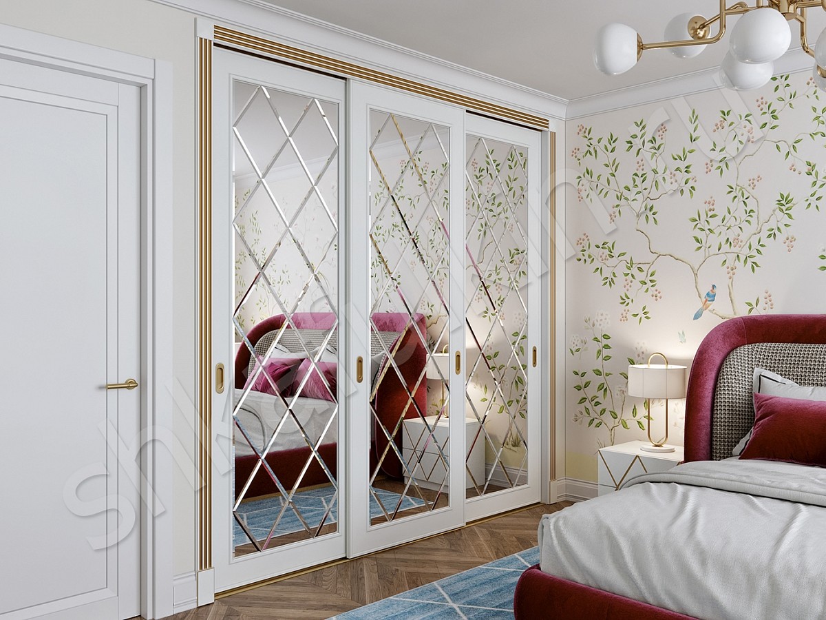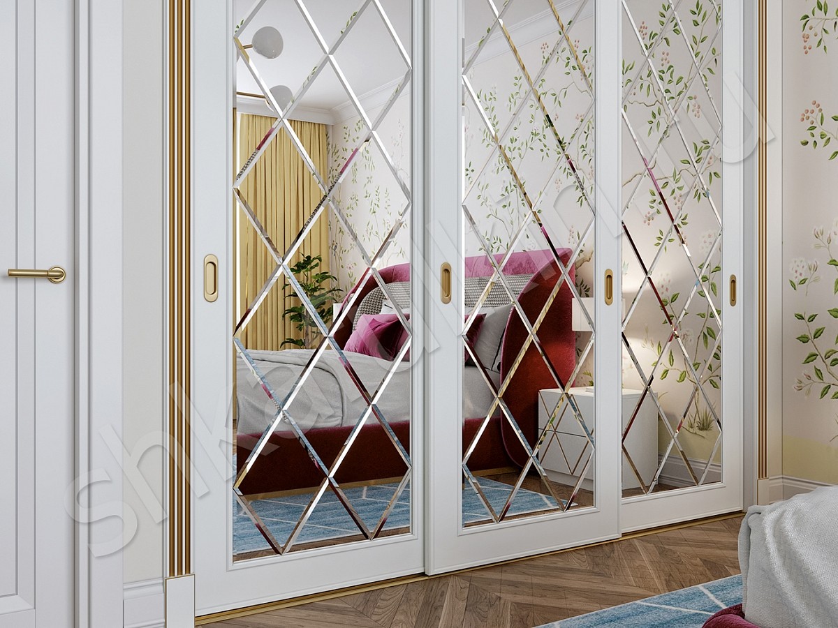 Двери: МДФ крашенные по RAL белого цвета с фрезеровкой, зеркало с фацетом 10мм