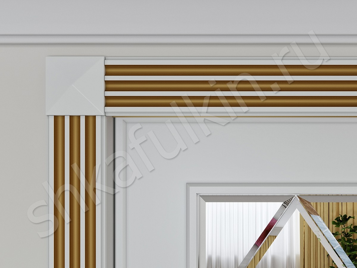 Корпус: на выбор более 180 цветов ДСП, МДФ, Стекло. Пилястры по периметру шкафа крашенные по RAL белого цвета с золотой патиной.