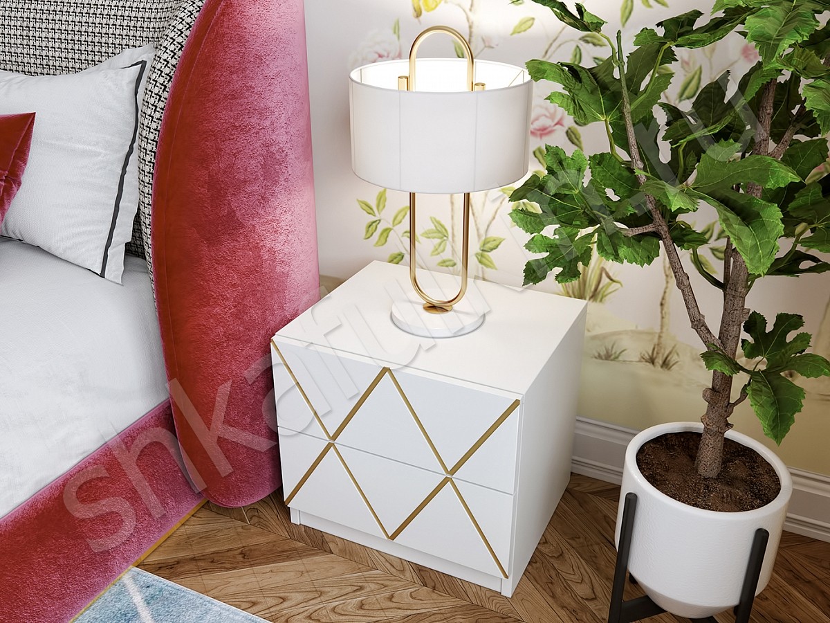 Фасад: из МДФ крашенный по RAL белого цвета с фрезеровкой и золотой патиной, открывание TIP-ON.