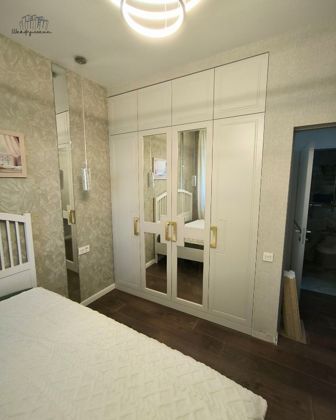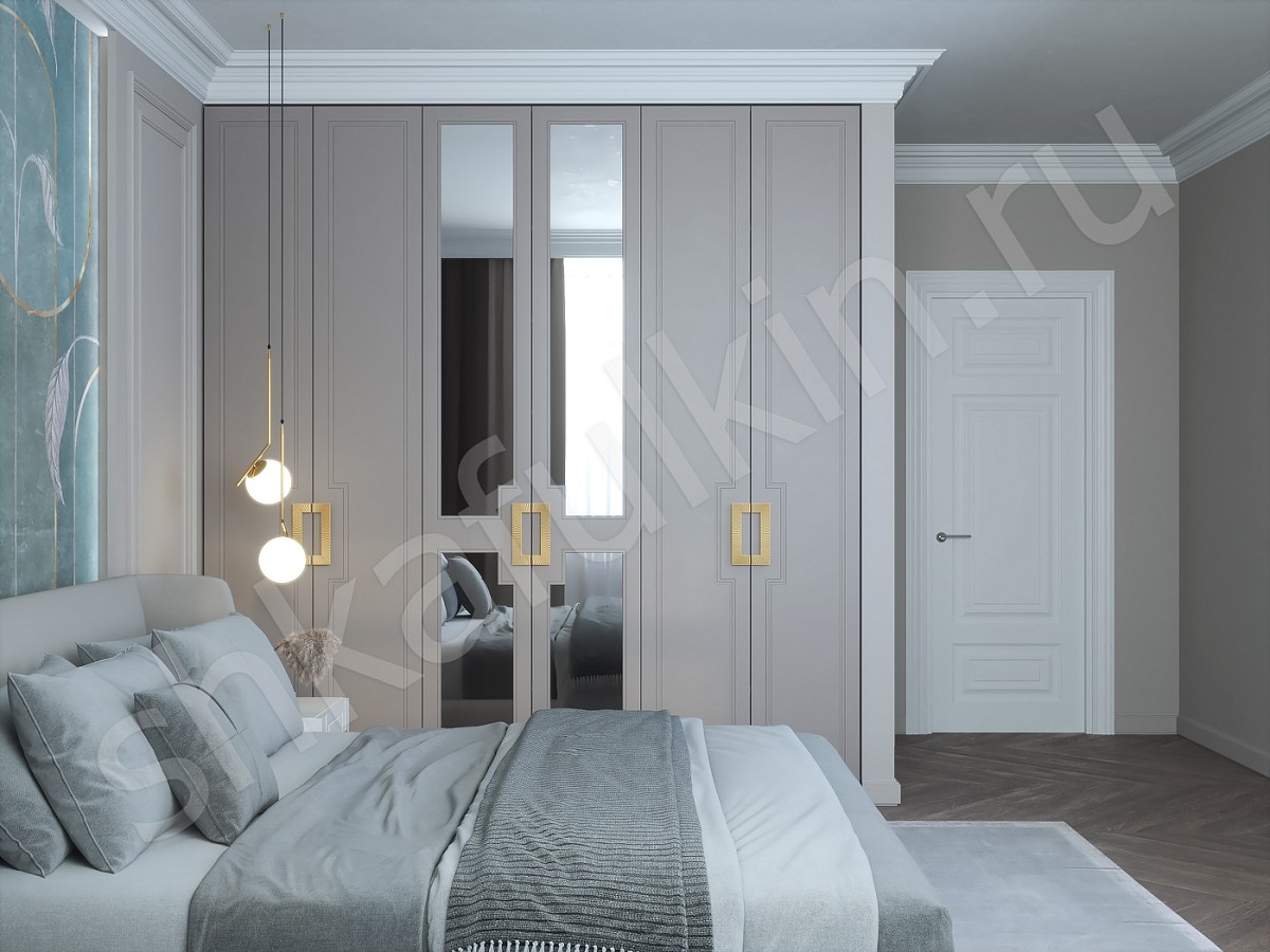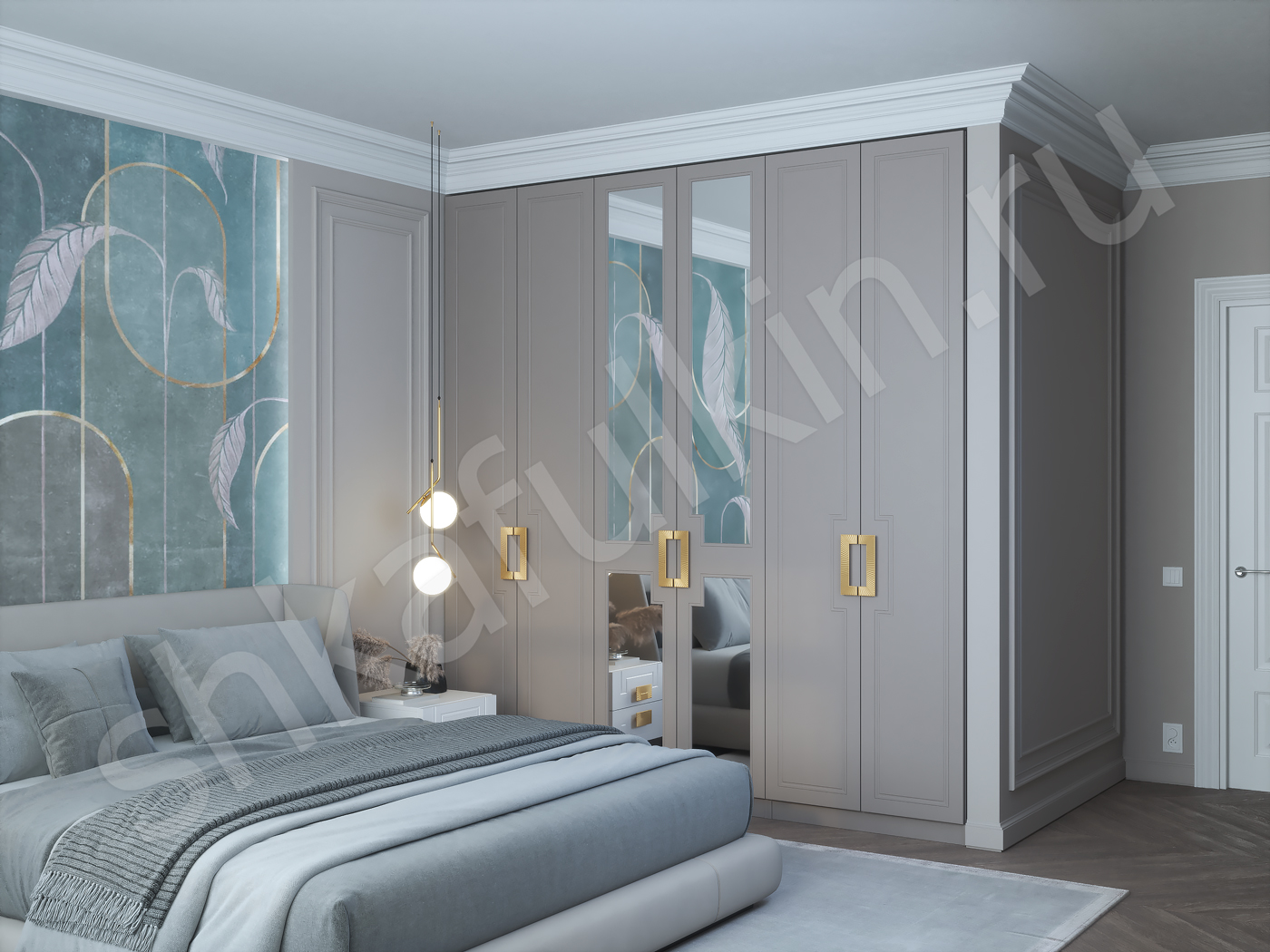 Фасады: МДФ с фрезеровкой и зеркалом покрашенный по NCS S 5502-Y.