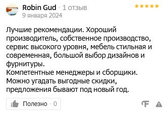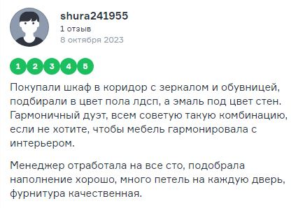 Добрый день! Заказывала шкаф в прихожую. Очень довольна! Качество мебели, работа менеджеров, доставка и сборка. Отдельное спасибо сборщику Игорю. Работа выполнена в соответствии с договоренностью, быстро, качественно и аккуратно. Очень доброжелательный сборщик, знающий свое дело. Рекомендую данную мебельную компанию!