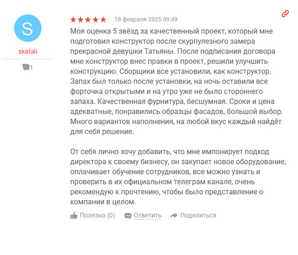 2. Выезд замерщика. Очень признательны Дмитрию за тщательный подход к замеру габаритов. При установке не было выявлено ни одного ошибочного миллиметра. Дмитрий уделил нам несколько часов, пока мы с супругом пытались определиться с цветовыми оттенками и материалами. Был весьма восприимчив ко всем нашим пожеланиям.