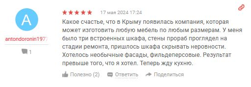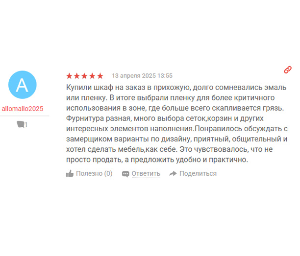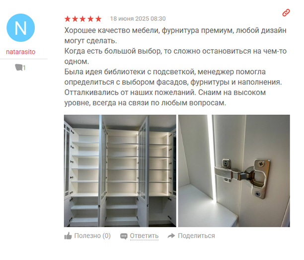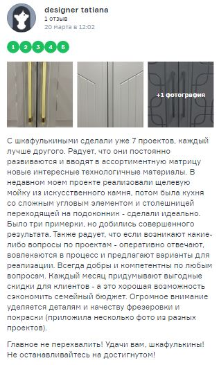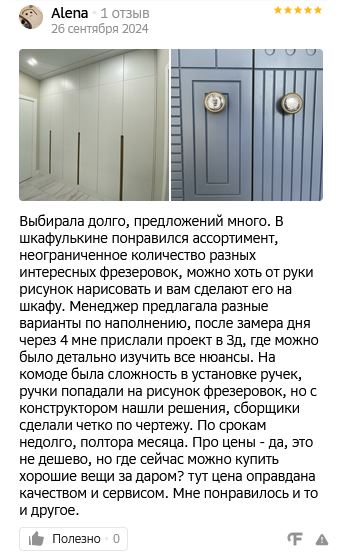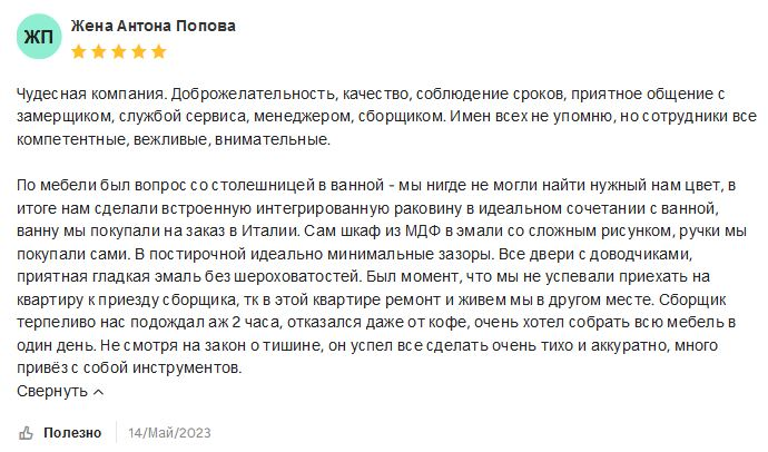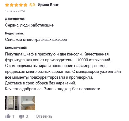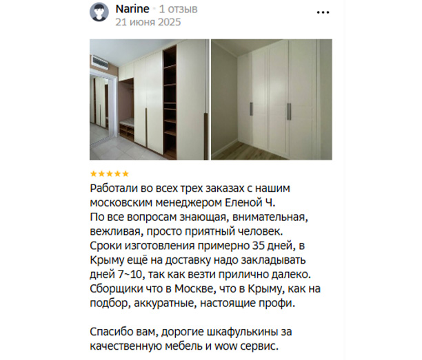 Заказывала мебель в гардеробную комнату. Осталась очень довольна. Приятно работать с грамотным и доброжелательным коллективом, который уважает и ценит свою работу. Шкафы получились на славу. Благодарю менеджера Митрофанову Анну, замерщика Михайленко Сергея, сборщиков Андрея и Михаила.