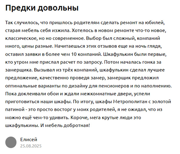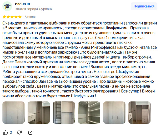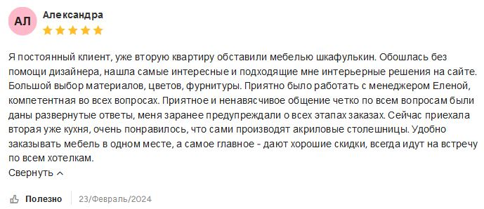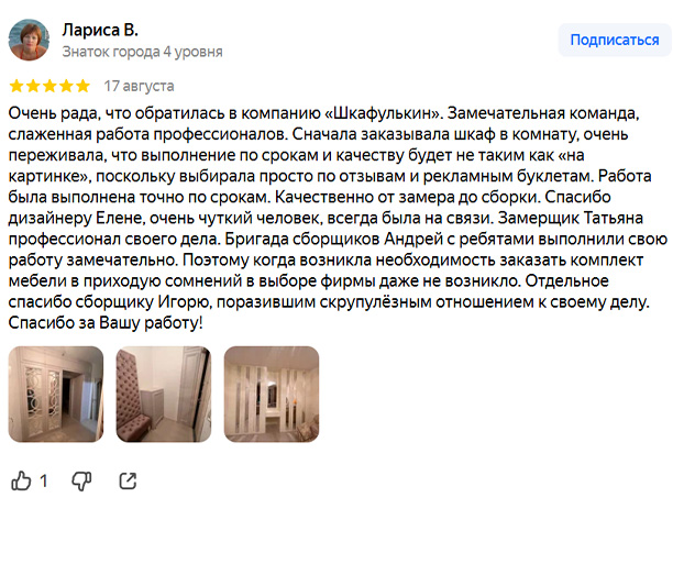 Благодаря Шкафулькину задуманное стало предметным и заняло свое место. Качественно, быстро, без нарушения сроков исполнения по договору, не завышенные цены. Рада, что заказала нужную мебель здесь. Очень рекомендую. Сотрудники всех служб работают на клиента, всегда оперативно информируют, никаких проблем с рекламацией. Моя благодарность всем сотрудникам за отличную работу.
