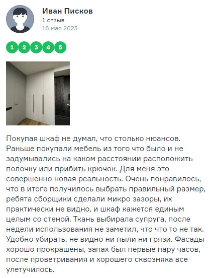 3. Сборка. Очень быстро и, главное, качественно собрали наш шкаф. Ребята оказались настоящими профессионалами. Работали очень аккуратно. Сами обратили наше внимание на заводской брак на одном из фасадов. Помогли оформить заявку на замену этой детали. Так что нам не пришлось с лупой осматривать шкаф на предмет недочетов. Оперативно привезли и установили новый фасад. Всегда звонили сами. Не нужно было обрывать телефон , чтобы выяснить вопросы по доставке и сборке.