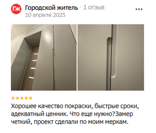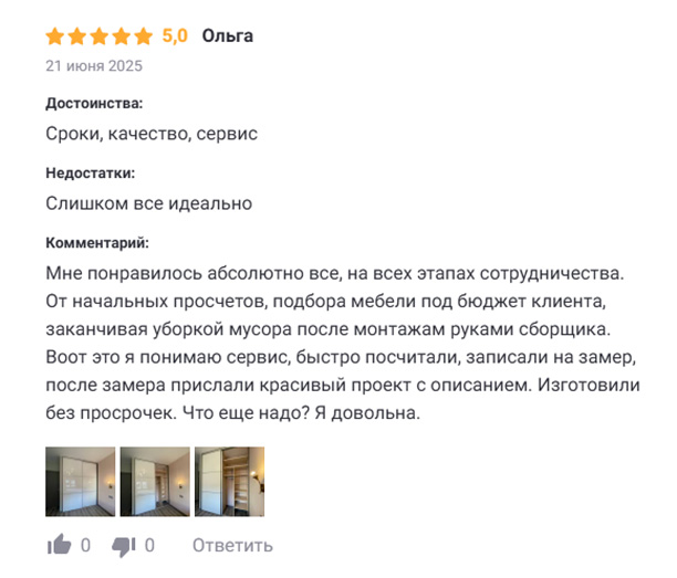 Если Вы хотите поделиться с нами своими впечатлениями о работе нашей компании, пожалуйста, напишите свой отзыв. Фото наших шкафов, которые присылают нам клиенты, мы публикуем в наших группах в социальных сетях. Присоединяйтесь!