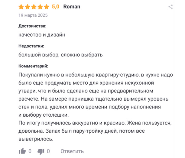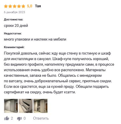 Итог. Круглая пятерка по всем пунктам. Если будем еще заказывать мебель, пойдет только в Шкафулькин.