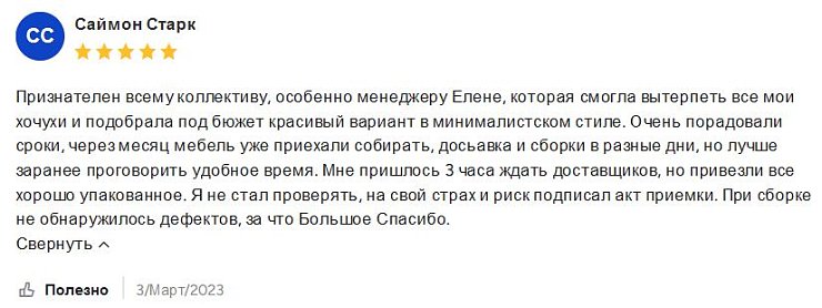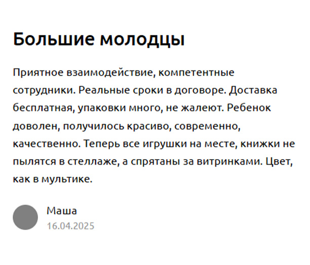 Огромное спасибо за вашу работу! Заказывали мебель для детской, беспокоились о результате, так как не работали с этой фирмой. Всё получилось отлично! Прекрасная команда, внимательные менеджеры, интеллигентные сборщики, соблюдение сроков!!! Искреннее благодарю и рекомендую!
